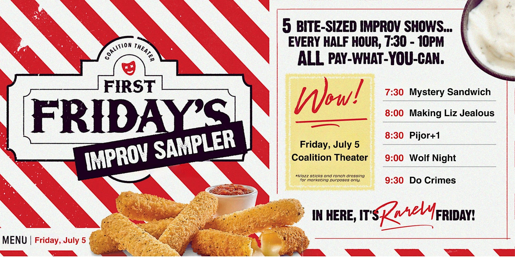 A tasty sampling of comedy at the Coalition! Five short shows, ALL pay what you can.
