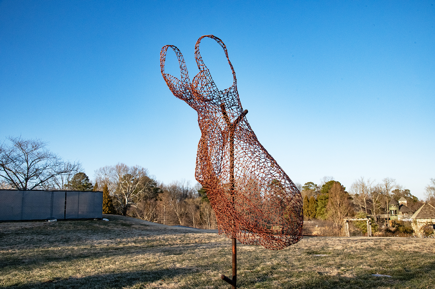 Currently on display through March 9 at the Lewis Ginter Botanical Garden, “Rich Soil” is composed of 29 life-size sculptures presented in seven groupings peppered throughout the garden. Made from thousands of pieces of wire, each statue takes the shape of a human form. Their striking, bold poses were inspired by famed modern dancer, choreographer and activist Alvin Ailey and his best known work, “Revelations” (1960). The statues’ translucent bodies emerge from the air like spirits, depicting joy, grief and hope through frames that appear soft and pliable, despite being made of hard metal.