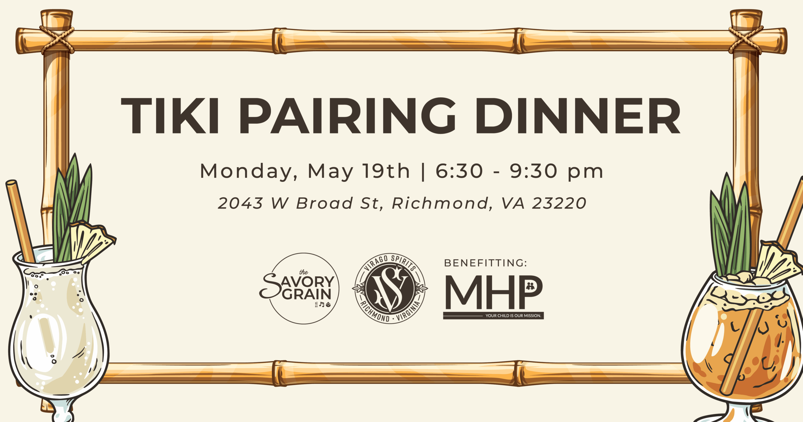 Join us for a special evening featuring a five-course meal prepared by The Savory Grain, with each dish perfectly paired with a cocktail crafted from Virago Spirits. Meet the distillers, learn how to create your own tiki-themed cocktails at home, and enjoy fun glassware giveaways alongside globally inspired dishes. A portion of sales will benefit Medical Home Plus.