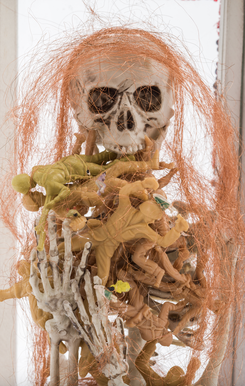 “Some of the materials and symbols that are seen in Oletha’s work are a mix of western technologies like cell phones and bullets,” Vongmalaithong says. “Also woven in are shells and beadwork. This theme of syncretism is especially evident in this collage of materials.”