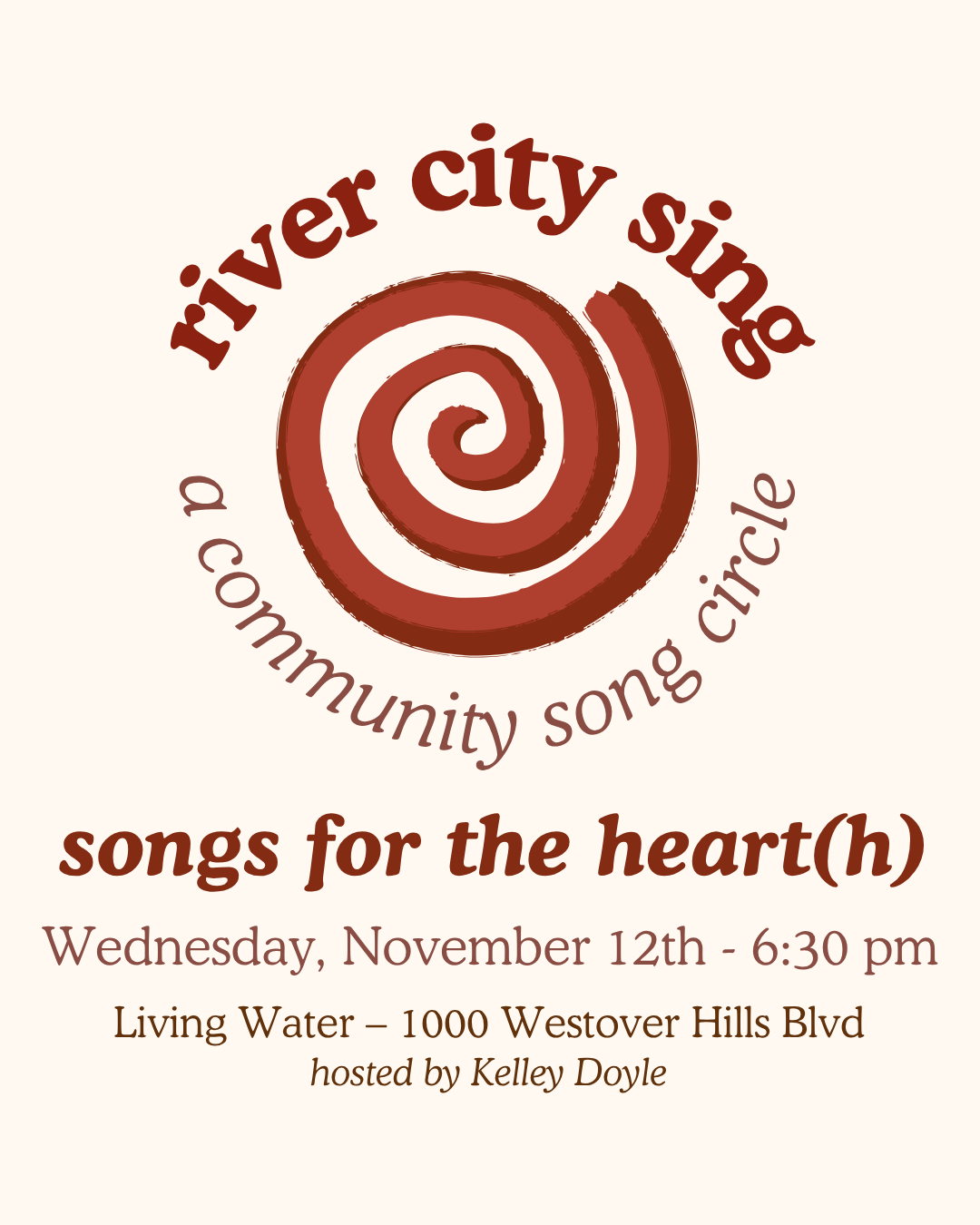 River City Sing is a new monthly song circle* meeting at Living Water Community Center! Our theme this month is “Songs for the Heart(h):”