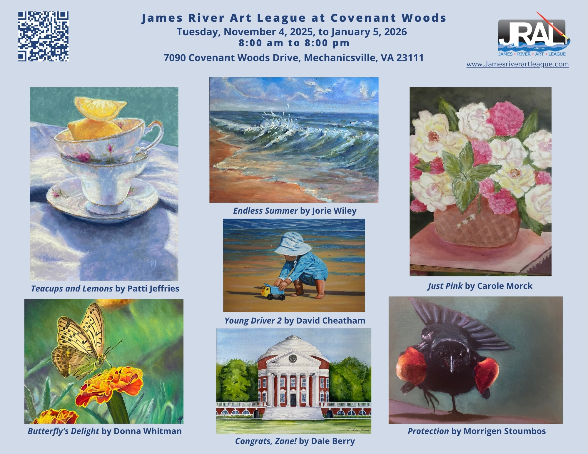 James River Art League (JRAL) is a 501(c)(3) nonprofit organization of more than 130 juried member artists from throughout Central Virginia. Our goal is to encourage the creation and appreciation of the visual arts. We provide our member artists with motivation, association, and continuing education through programs that feature qualified artists and art professionals, and we provide opportunities for members to exhibit artwork in venues throughout the Richmond area. JRAL artists work in a wide range of art media, including oil, acrylic, watercolor, pastel, graphite, pen and ink, collage, silk screen, scratchboard, photography, sculpture, and more. Please visit our exhibit to see a sampling of members’ artwork. For more information, visit our website: https://www.jamesriverartleague.com/
