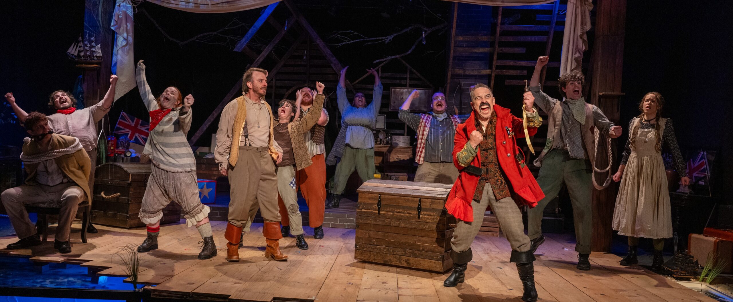 As one might expect, transporting treasure on the high seas attracts pirates, including the most evil villain of all, Black Stache (Scott Wichmann). His dastardly pursuit will ultimately involve storms, shipwrecks, an island full of wacky Brit-hating natives, and a bittersweet romance. Along the way, the fundamentals of the Peter Pan story slot cleverly into place.