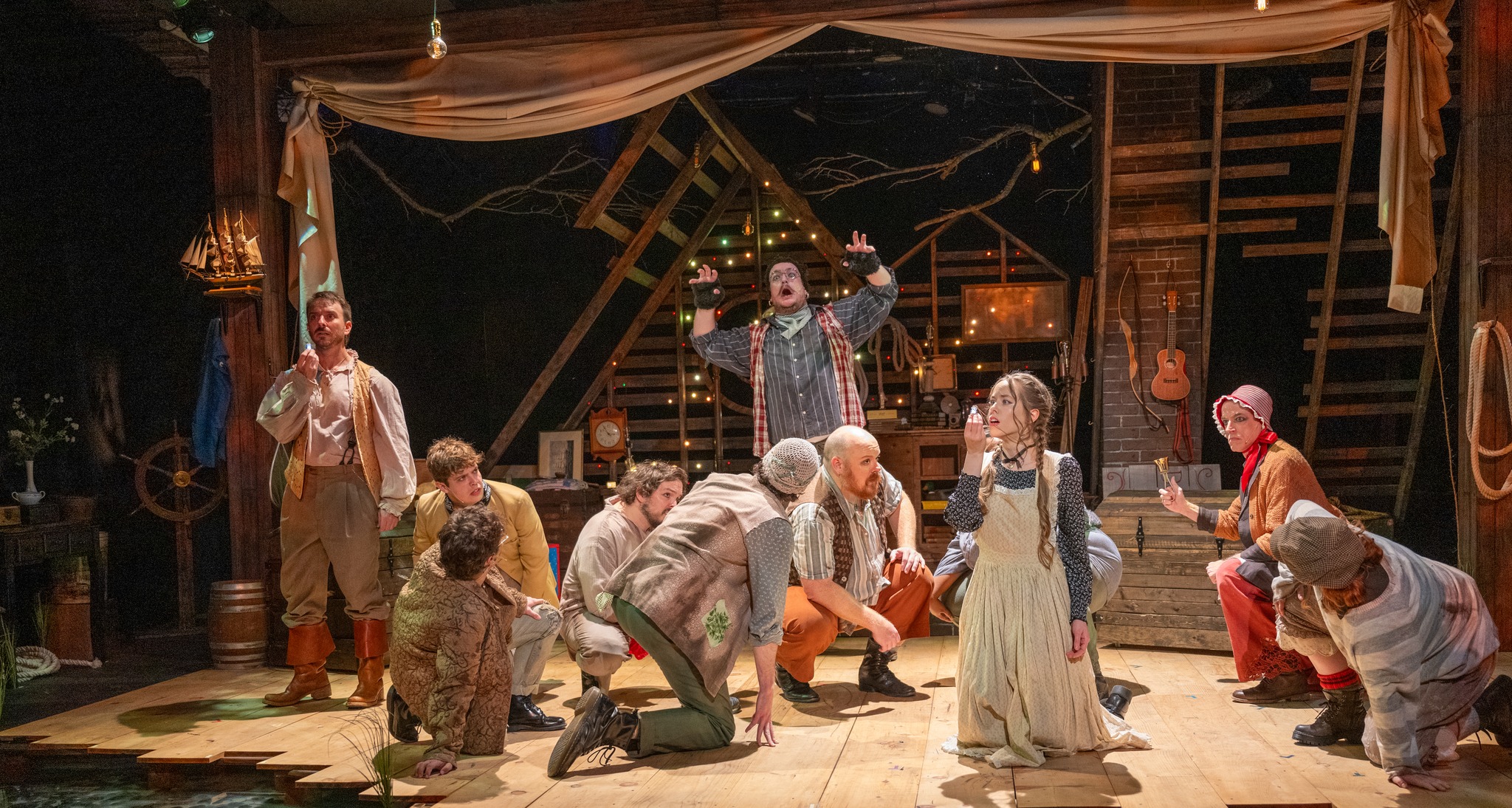 As directed by Nathaniel Shaw, “Starcatcher” manages to evoke the magical imagery of fairy tales without a lot of technical whiz-bangs. A cast of 12 fills a relatively small stage that is already overstuffed with evocative, seafaring bric-a-brac, generating an energy of chaotic good-humor while never obscuring the fanciful tale at the show’s core.