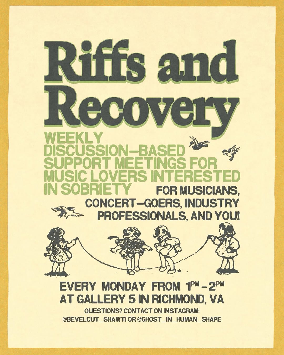 Riffs and Recovery weekly meetings take place at Gallery5 every Monday from 1-2 p.m. More information is on Instagram at @riffsandrecovery