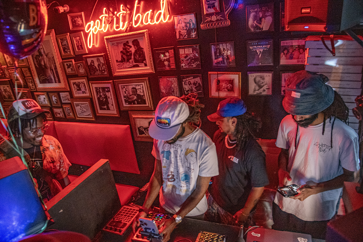 The most attentive and curious members of the crowd gather around the tiny DJ booth at the bar’s northwest corner, studiously watching the producers’ 404 trickery. The sampler has a built-in effects bank, so each musician — including the designated DJ — affects the tunes with sudden blasts of reverb, filter sweeps, and glitching noise. When someone drops a particularly impressive flip or deploys speaker-crushing bass, faces contort, and shouts of “Oooh!” ripple throughout the room.