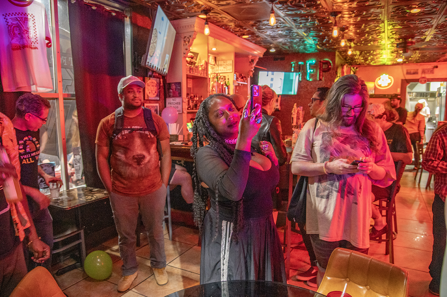 Most people drift around the bar, saying hello to friends, downing shots of tequila and nursing cans of Tecate, eventually dipping outside to add to the cloud of smoke and vapor wafting towards the roof. All in all, it’s a low stakes good time — the vibe is convivial, celebratory, and incredibly welcoming.