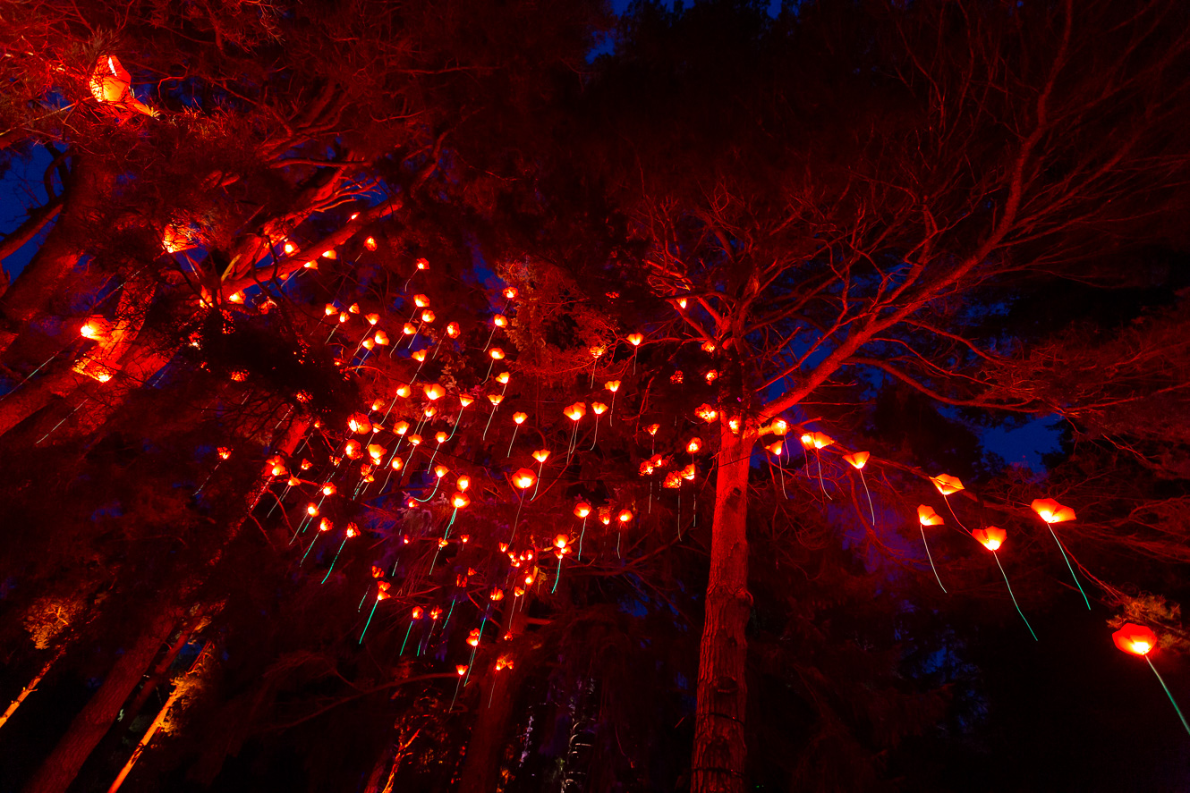 Next you continue along the Glow path, which is lined with light installations by international artists along the way to the Glow village on the Carriage House Lawn. The installations are fanciful interpretations of flowers, grasses and reeds, some towering 21’ high, with others suspended from tree branches along the Woodland Trail.