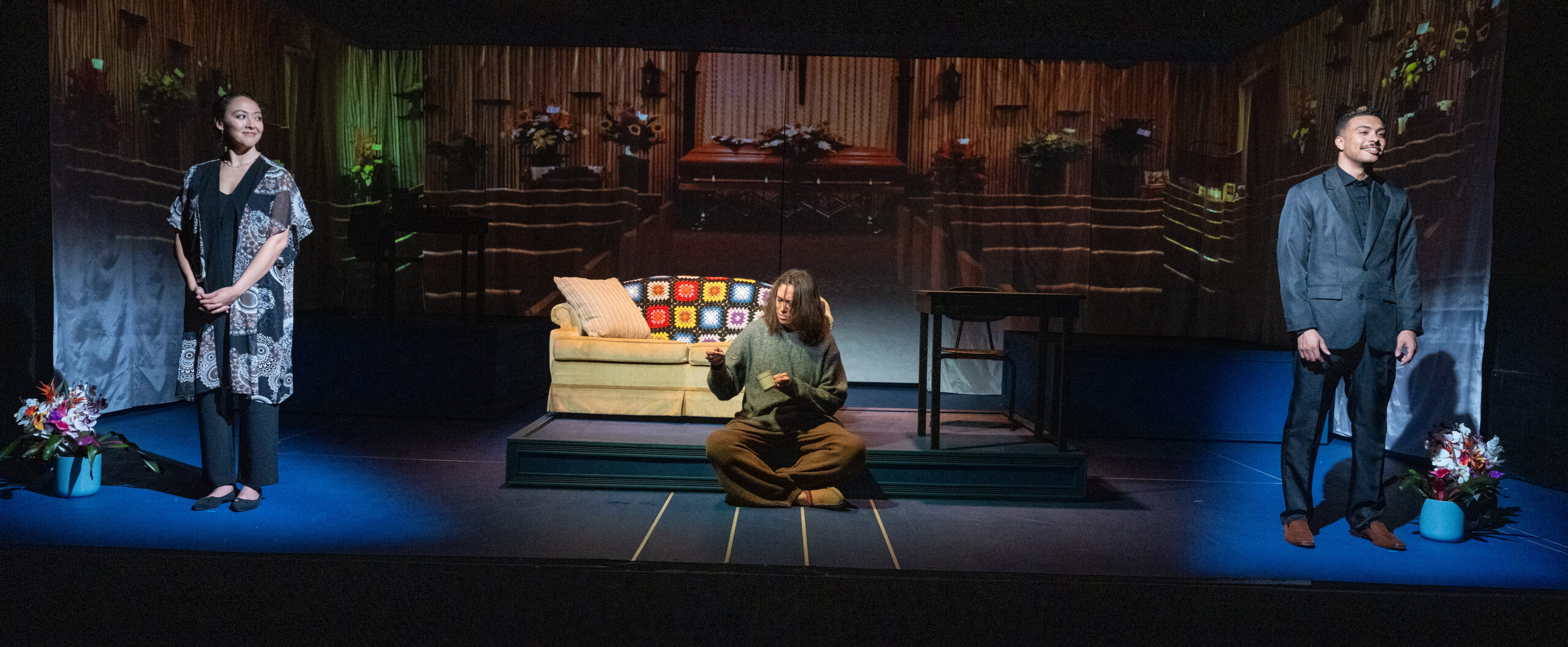Lewis accomplishes this with the aid of Tennessee Dixon, who has created a truly amazing array of projections that ground the production without ever overwhelming it. From simply indicating a character’s location (San Diego, Japan, etc.) to rendering settings as varied as a flower shop to the wilds of Puerto Rico, the projections help establish a fully realized world for these characters to inhabit.