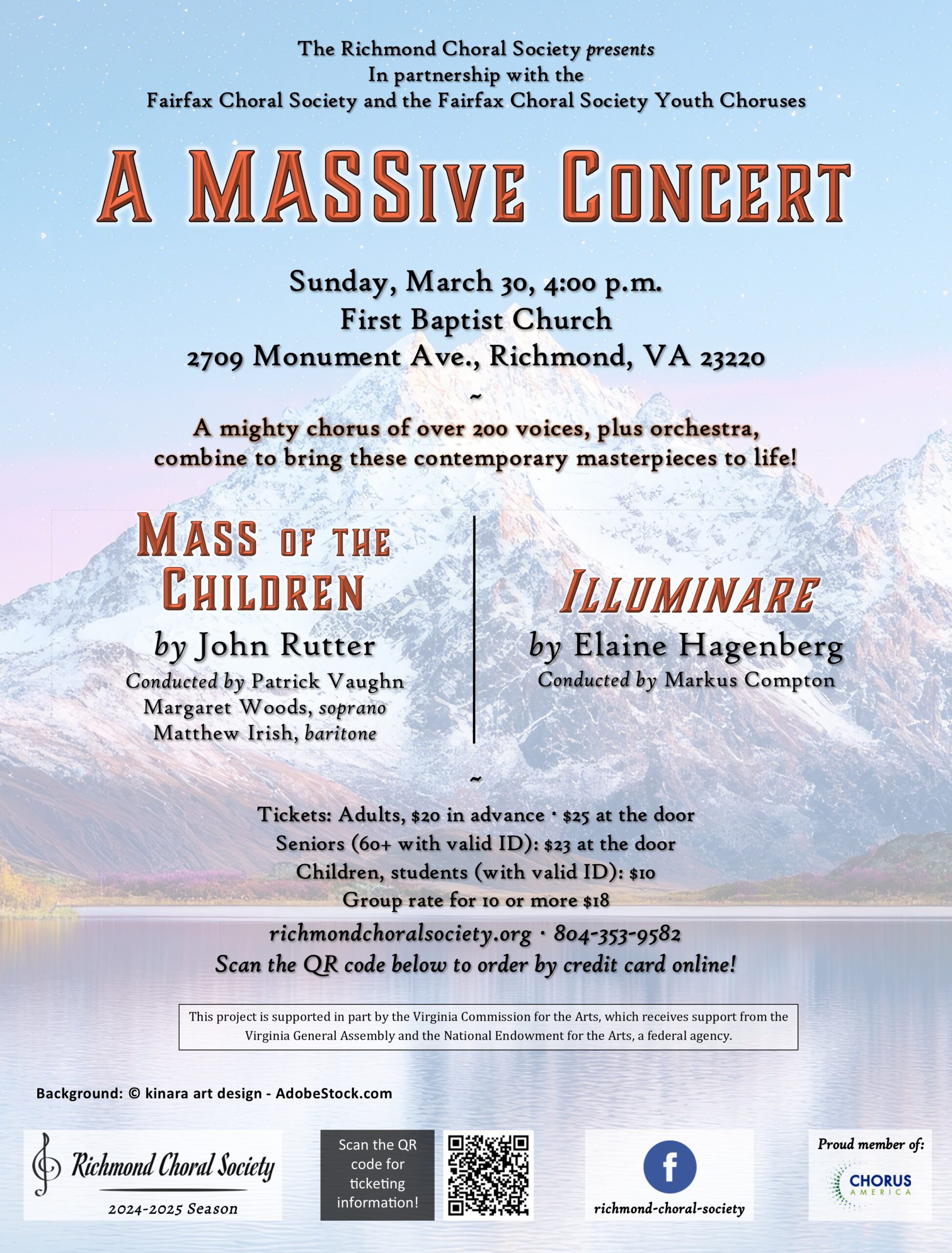 The Richmond Choral Society in partnership with the Fairfax Choral Society and the Fairfax Choral Society Youth Choruses presents Mass of the Children by John Rutter, Patrick Vaughn, conductor; Margaret Woods, soprano; Matthew Irish, baritone and Illuminare by Elaine Hagenberg Markus Compton, conductor. A mighty chorus of over two hundred voices and orchestra will combine to bring these contemporary masterpieces to life! To order tickets please visit our website.