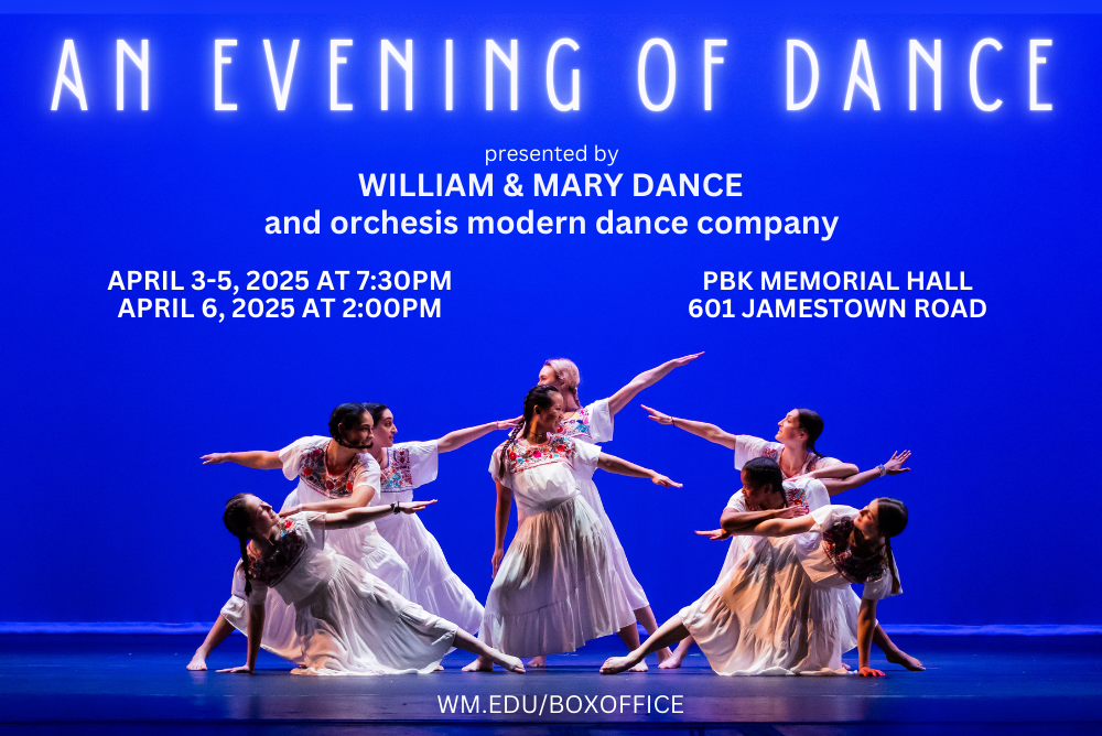 William & Mary’s Department of Theatre & Performance presents An Evening of Dance, April 3rd through April 6th. This annual dance concert features thought-provoking pieces by student choreographers, performed by their peers in the Orchesis Modern Dance Company, under the mentorship of the Dance faculty. An Evening of Dance showcases the extraordinary talents of William and Mary students in choreography, production, and performance. April 3rd through April 6th at Phi Beta Kappa Memorial Hall. For tickets, visit https://go.wm.edu/2rjzxk