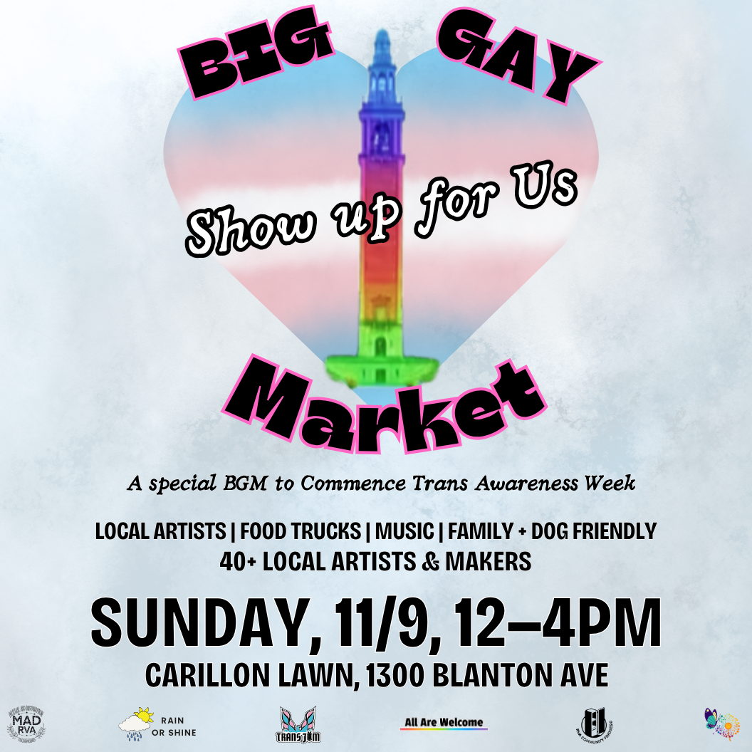 Join TransJam alongside local orgs and numerous Trans & queer artists at the Carillon on Sunday, November 9th for a Big GAY market to show up for and support over 40 LGBTQ+ and ally makers. Start your holiday shopping, get yourself a treat or queer-made trinket, come be around others who care about you and want you to thrive.