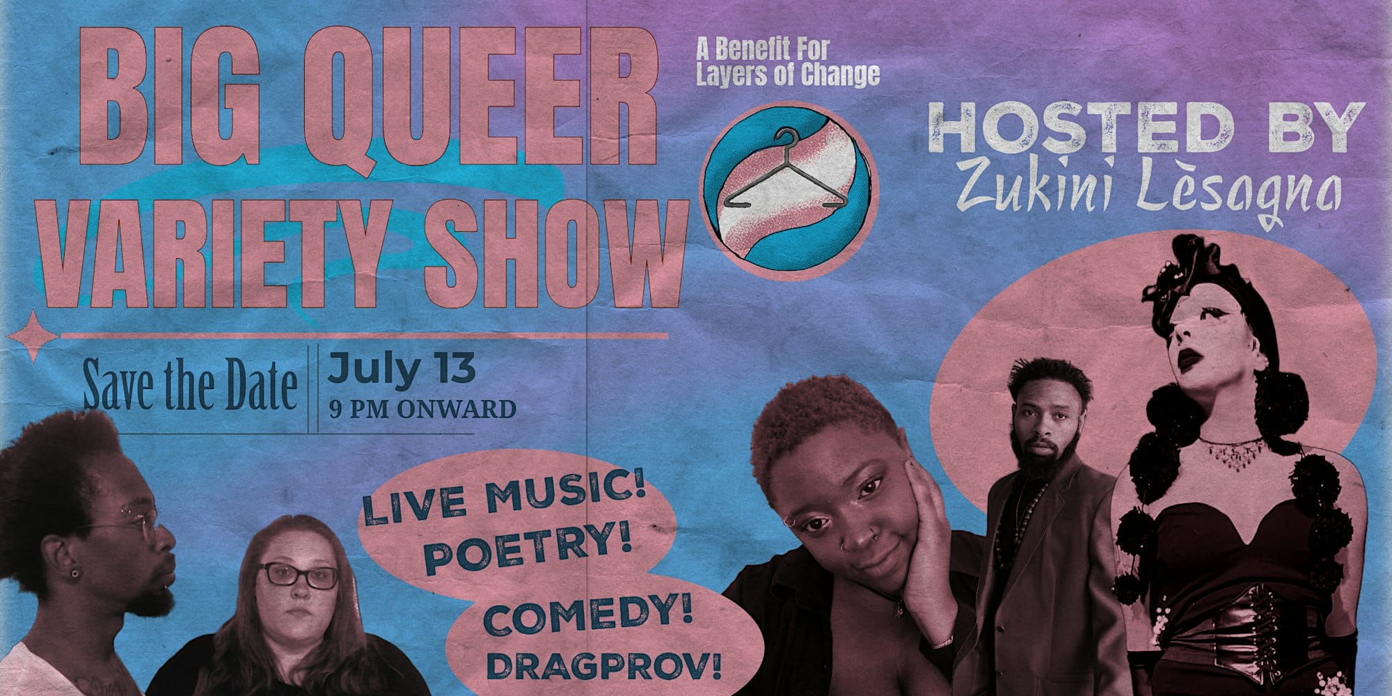 Join us on July 13th for the BIG QUEER VARIETY SHOW, hosted by the very essence of drag personified Zukini Lèssagna. Doors open at 8:30 PM, and the show kicks off at 9 PM sharp. This spectacular event will feature an unforgettable evening of live music, poetry, comedy, and dragprov (drag+improv, get it?)