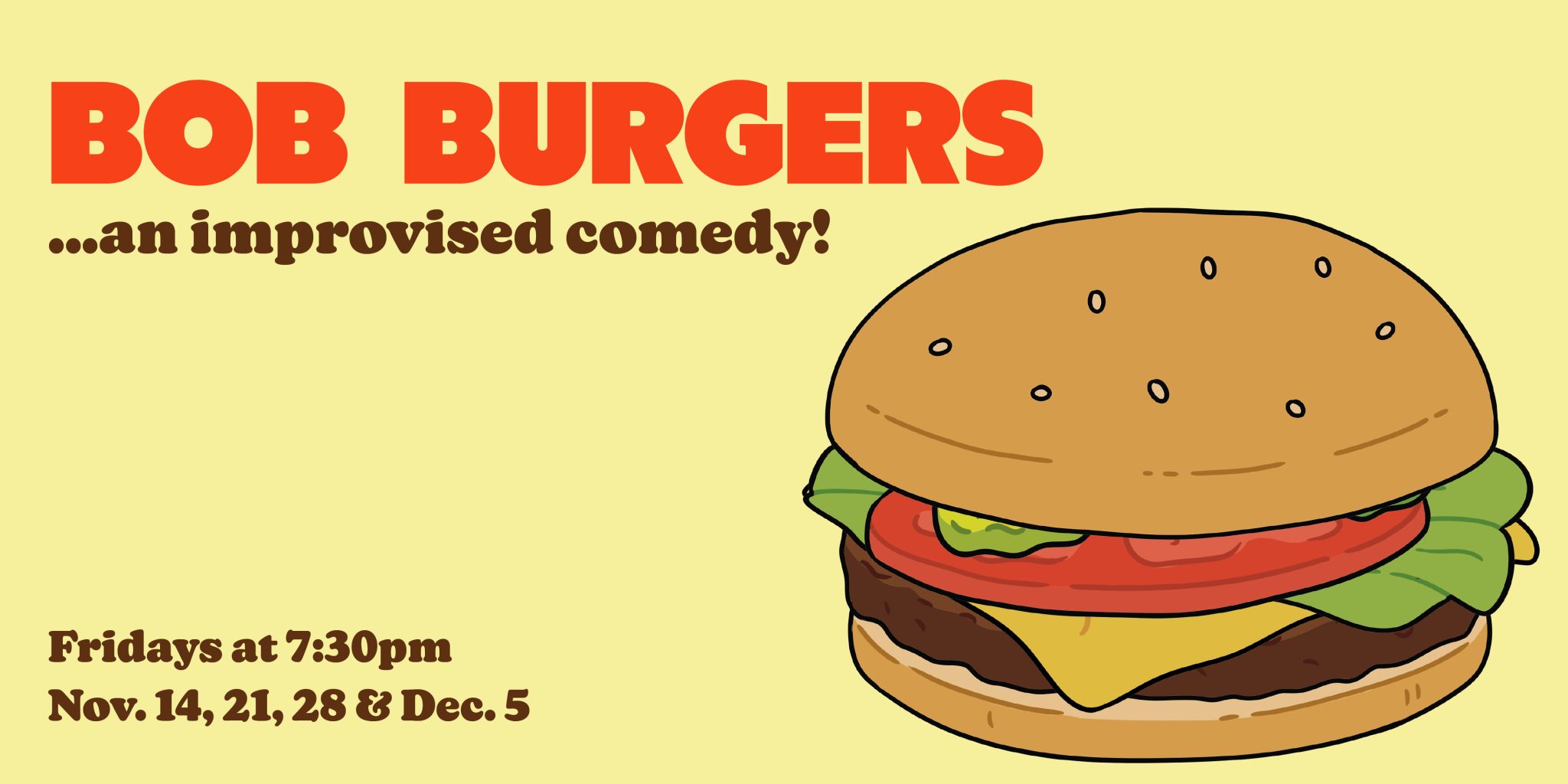 “Bob Burgers: an improvised comedy” is the unofficial sitcom adaptation that will be sure to have you coming back for seconds. Join the beloved inhabitants of Seymour’s Bay as they navigate the quirky seaside town they call home. These completely unique “episodes” will be made with only the finest of ingredients: your suggestions!