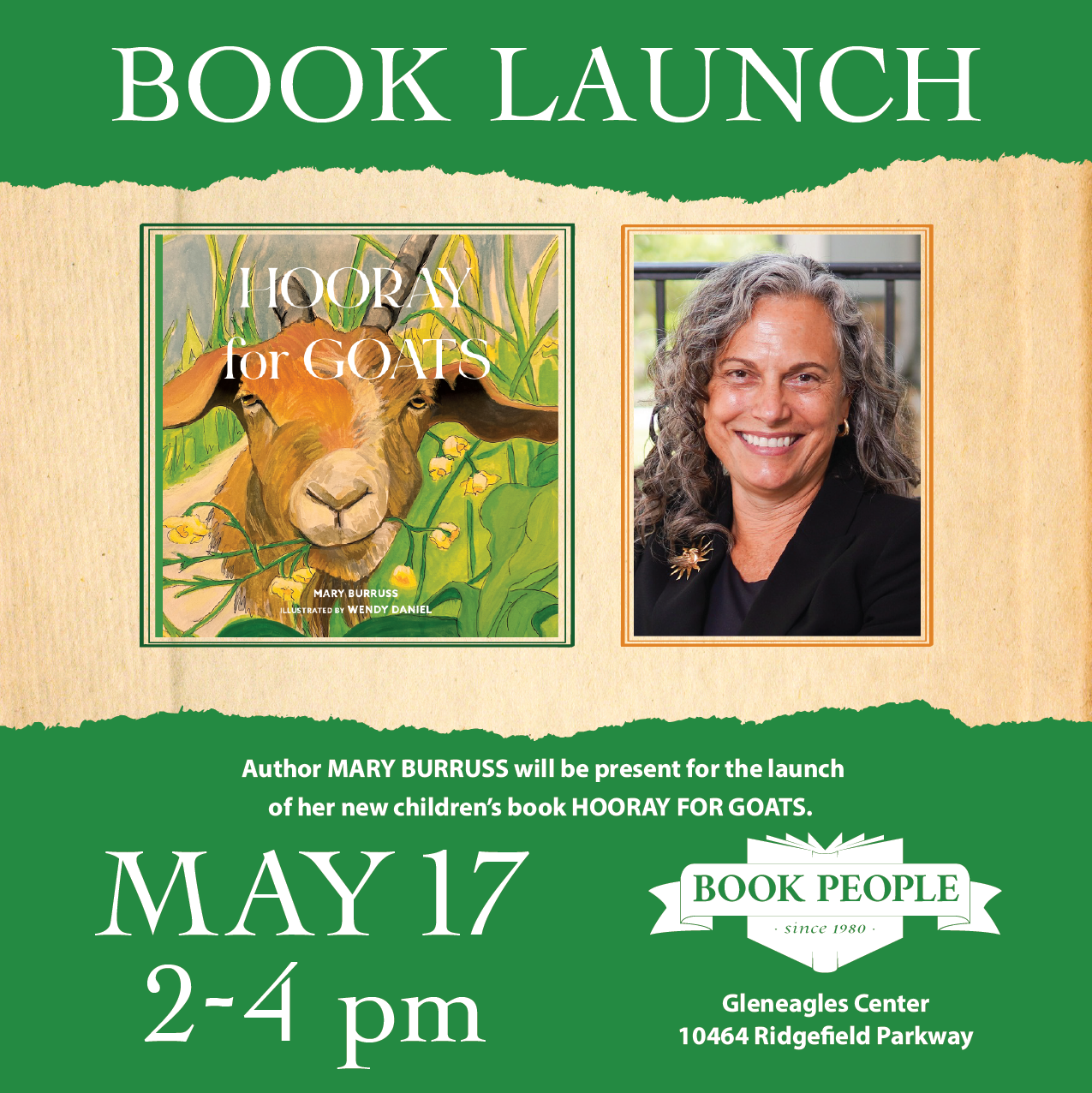 Join Mary Burruss for the launch of her new book Hooray for Goats.
