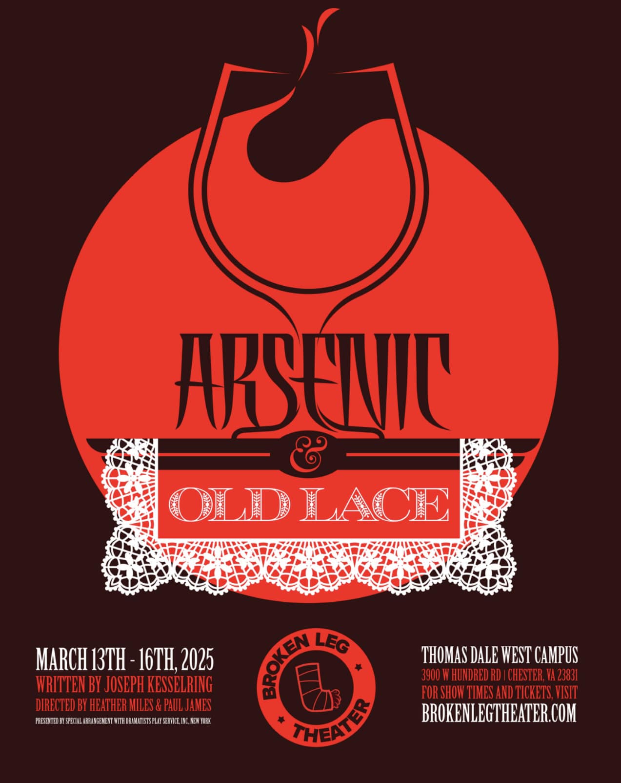 The show runs March 13-16, 2025. Visit www.brokenlegtheater.com for tickets and information.