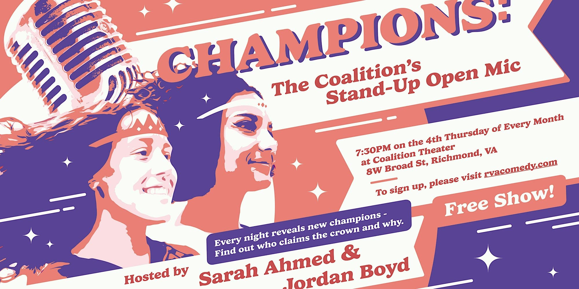 CHAMPIONS open mic stand-up show takes place on the 4th Thursday of every month, hosted by Sarah Ahmed and Jordan Boyd.