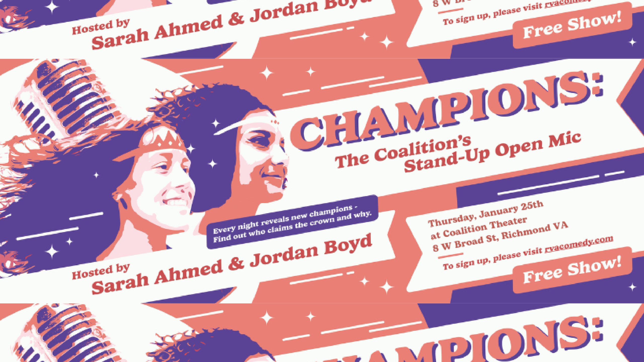 CHAMPIONS open mic is the 4th Thursday of every month (but this month it’s the third Thursday! We’re wild and carefree here!), hosted by Sarah Ahmed and Jordan Boyd. And oh, this night is full of surprises.