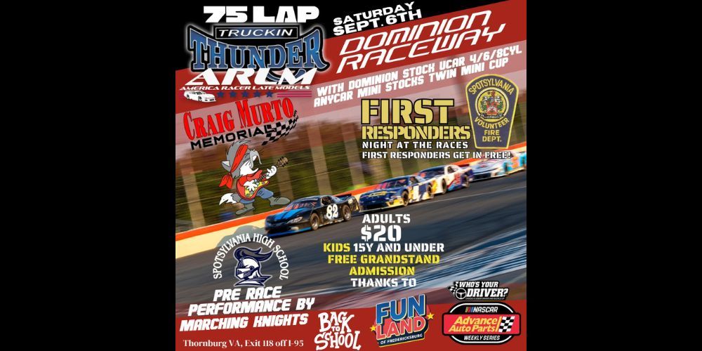 First Responders and Military get in FREE along with KIDS 15 and under with a paid adult THANKS TO Fun Land Fredericksburg. The Spotsylvania High Marching Knights will be here for a pre race performance and we will have a special GUITAR NATIONAL ANTHEM to pay tribute to Craig Murto!