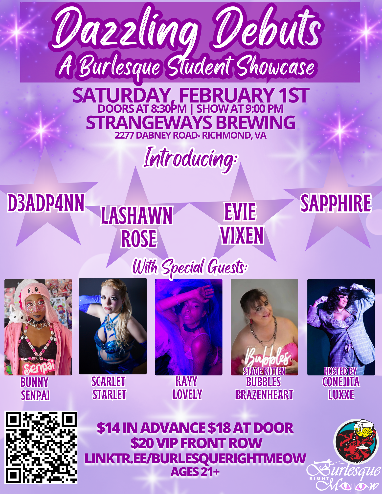 Get ready to witness the debut of fresh burlesque talent at Strangeways Brewing! These rising stars have been strutting their way through Scarlet Starlet’s Burlesque Foundations course and are ready to light up the stage with a group number and unique solo acts of their own creation. Come cheer them on as they take their first steps into the spotlight!