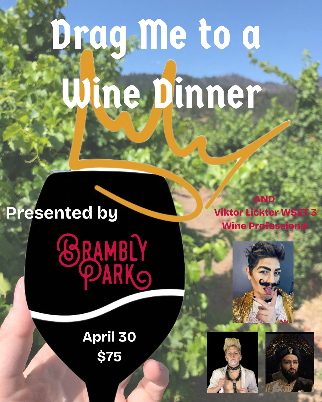 Join us on April 30, 2025 for Brambly Park’s first ever Drag Me to a Wine Dinner!!! Upstairs in our private event lounge for the first time, you’ll have a 4-course meal with wine pairings and accompanied by drag performances throughout the dinner, featuring Viktor Liktor, certified wine professional, Mac Frost, and Arik LeDouche. It’ll be a night of performances, food, and wine that you’ll never forget!