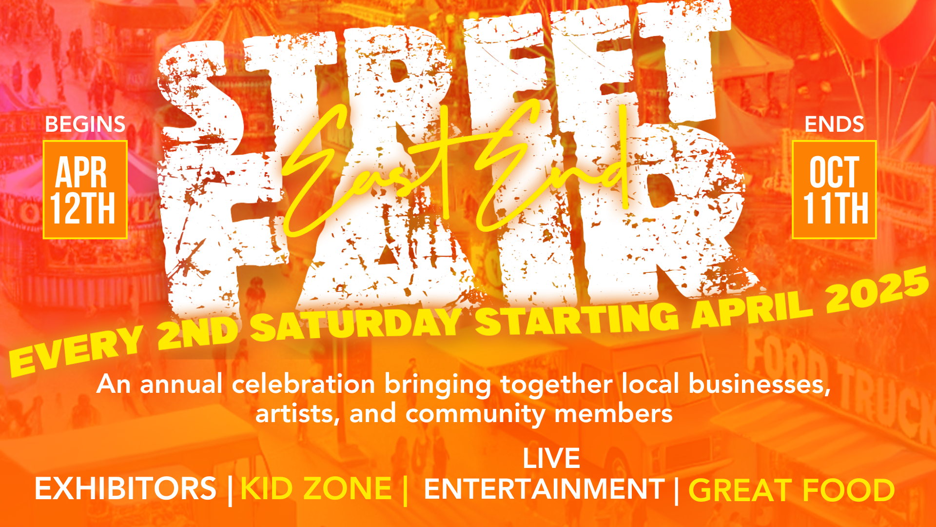 The East End Street Fair was founded in 2024 with a bold vision—to bring liveliness, culture, and fun back to the heart of the community. What started as a small initiative to reignite the energy of the East End has quickly grown into a highly anticipated event, bringing together local businesses, artists, food vendors, and families for an unforgettable experience every 2nd Saturday.