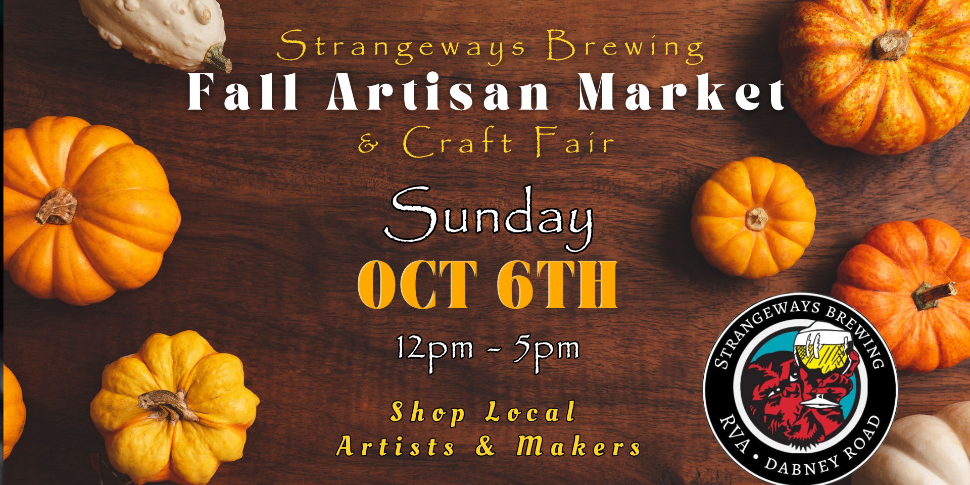 Join us for a Fall Artisan Market and Craft Fair at Strangeways Brewing in Scotts Addition. Pick up fall decor and early holiday gifts! We bring together amazing local artists and makers selling handmade home décor, art, jewelry, woodworking, vintage, handmade apparel, and more! Indoor Event.