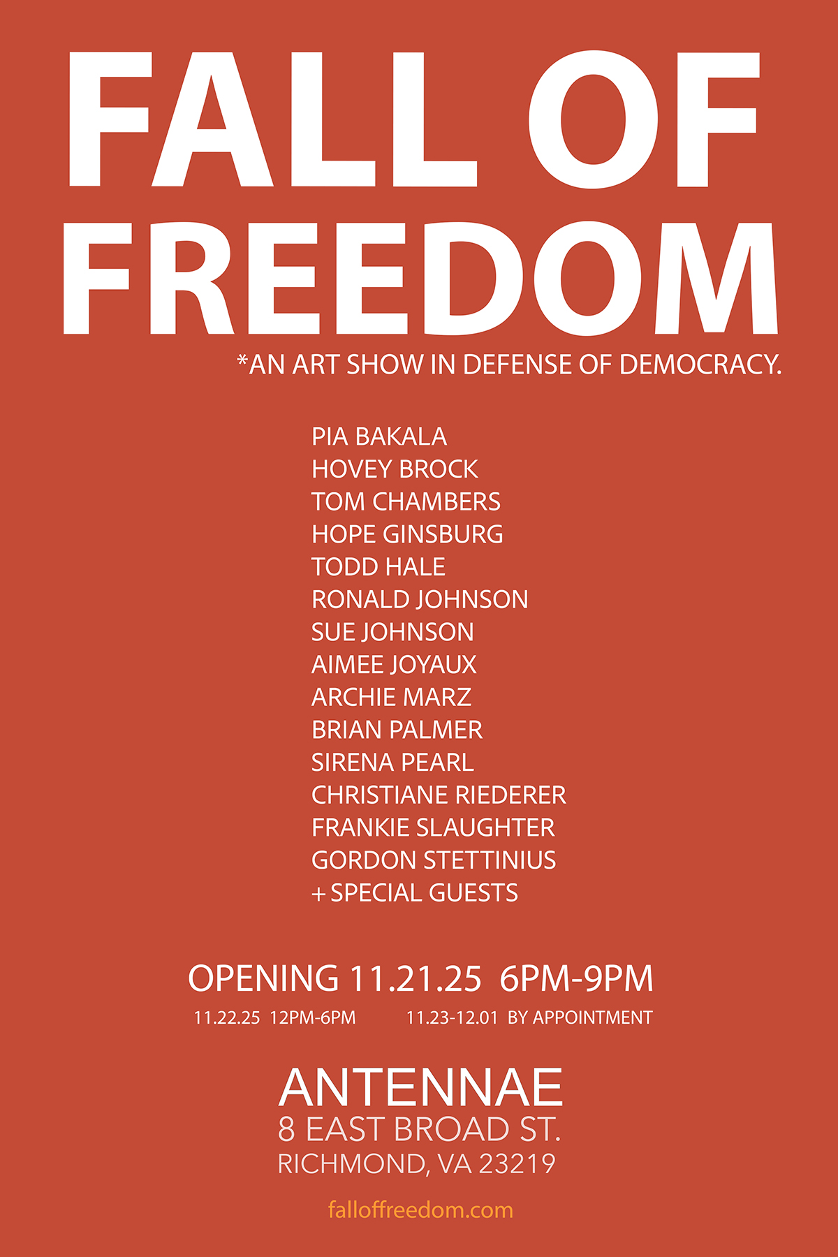 Fall of Freedom in RVA opens at Antennae, 8 E. Broad St., on Friday, Nov. 21, 6 – 9 pm. This pop-up art exhibit is also on view Saturday Nov. 22, 12 – 6 pm, and by appointment Nov. 23 – Dec. 1.