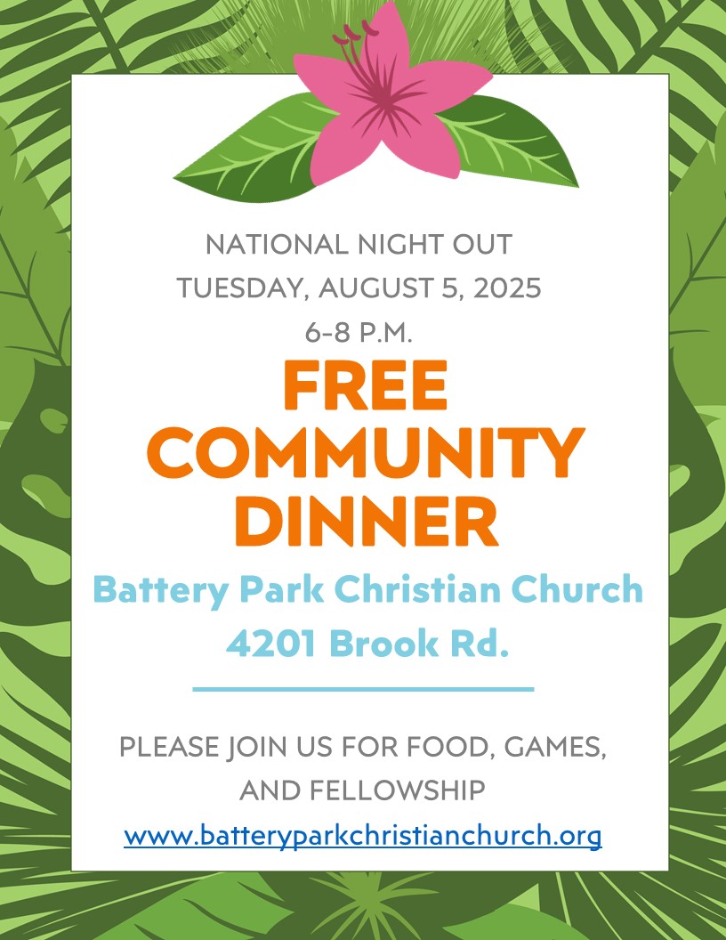 Battery Park Christian Church, 4201 Brook Rd., will be hosting a Free Community Dinner on Tuesday, August 5, 2025. We will have food, games, fun, and fellowship. We hope you can join us!
