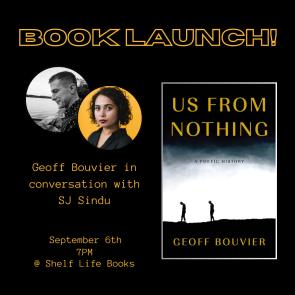 Join us for the launch of Geoff Bouvier’s new book of poetic history, US FROM NOTHING! Geoff will be in conversation with fellow poet and local author SJ Sindu.
