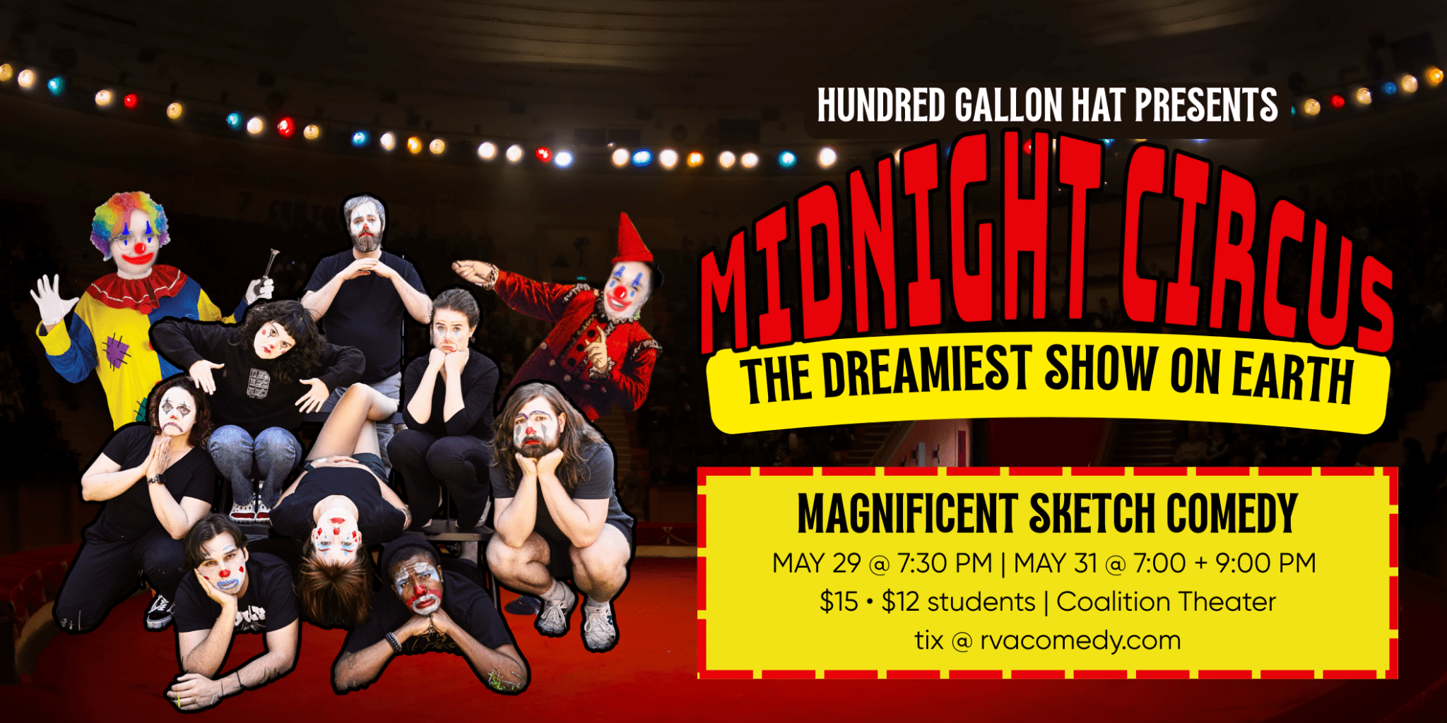 Have you ever wanted to see the circus? Ever had a dream you were sad to wake up from? Ever wanted those two disparate concepts to be connected through a bevy of sketch comedy? Well, Hundred Gallon Hat has the show for you! Welcome to the Midnight Circus! The Greatest Show on Earth!