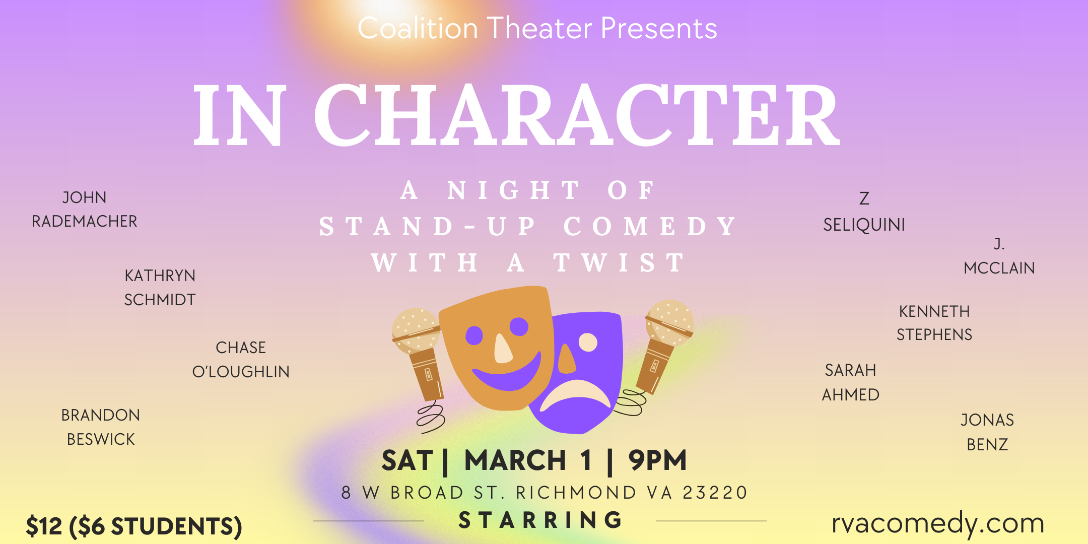 Escape reality with Coalition’s new show “In Character.” This explosive stand-up show features a hilarious lineup of comedians unleashing their most outrageous alter egos. Get ready for a wild, unpredictable journey through the minds of the absurd as these unforgettable characters take the stage.