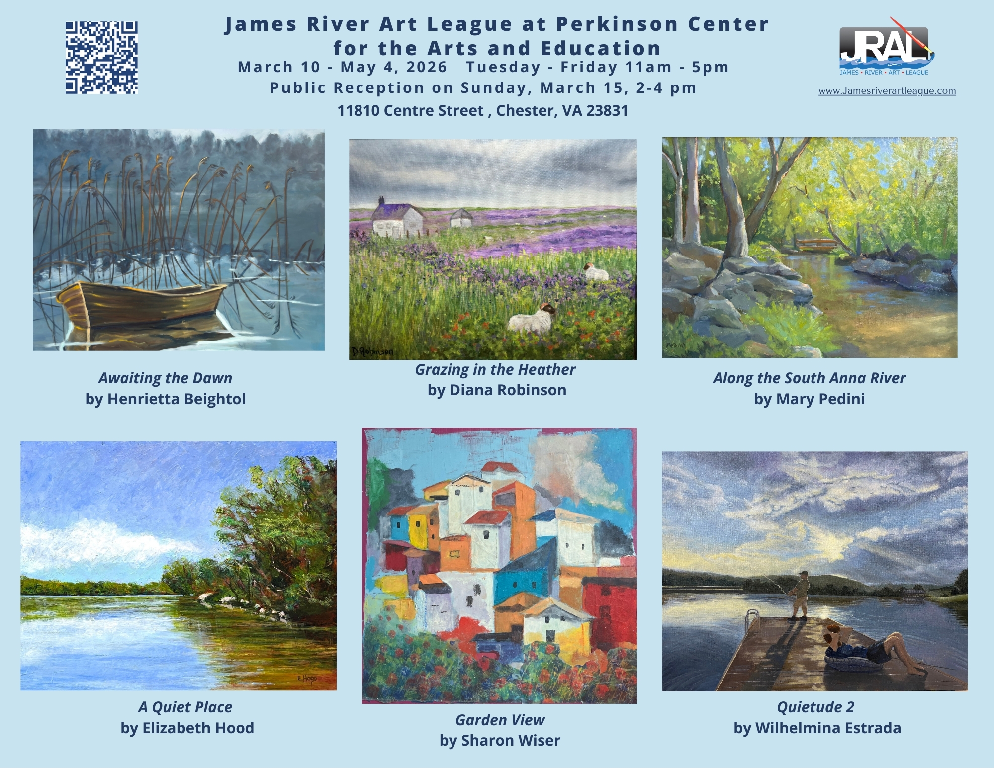 James River Art League (JRAL) is a 501(c)(3) nonprofit organization of more than 130 juried member artists from throughout Central Virginia. Our goal is to encourage the creation and appreciation of the visual arts. We provide our member artists with motivation, association, and continuing education through programs that feature qualified artists and art professionals, and we provide opportunities for members to exhibit artwork in venues throughout the Richmond area. JRAL artists work in a wide range of art media, including oil, acrylic, watercolor, pastel, graphite, pen and ink, collage, silk screen, scratchboard, photography, sculpture, and more. Please visit our exhibit to see a sampling of members’ artwork. For more information, visit our website: https://www.jamesriverartleague.com/