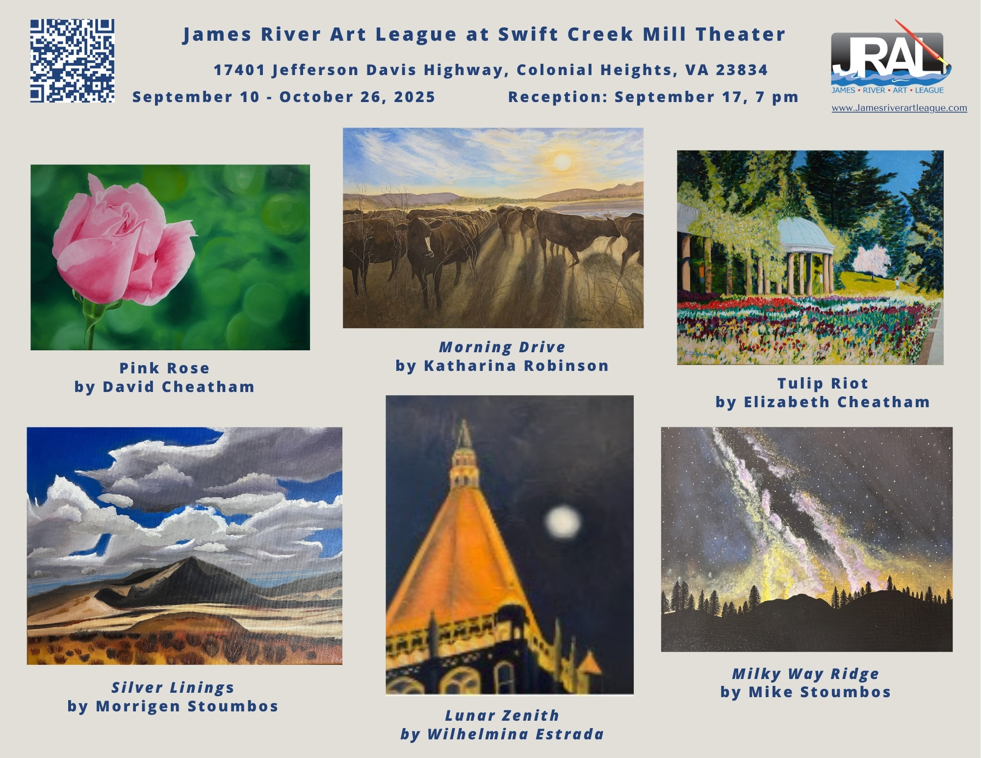 James River Art League (JRAL) is a 501(c)(3) nonprofit organization of more than 130 juried member artists from throughout Central Virginia. Our goal is to encourage the creation and appreciation of the visual arts. We provide our member artists with motivation, association, and continuing education through programs that feature qualified artists and art professionals, and we provide opportunities for members to exhibit artwork in venues throughout the Richmond area. JRAL artists work in a wide range of art media, including oil, acrylic, watercolor, pastel, graphite, pen and ink, collage, silk screen, scratchboard, photography, sculpture, and more. Please visit our exhibit to see a sampling of members’ artwork. For more information, visit our website: https://www.jamesriverartleague.com/