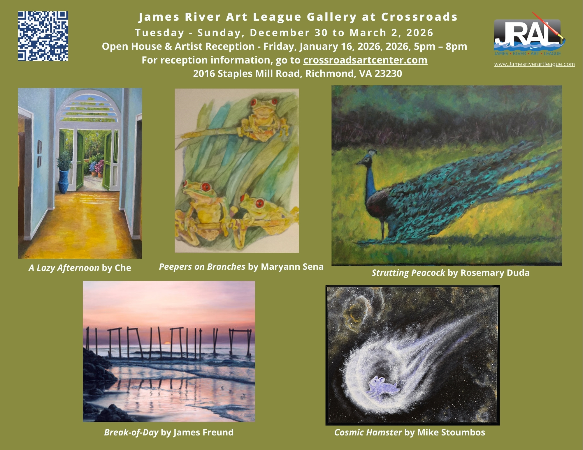 James River Art League (JRAL) is a 501(c)(3) nonprofit organization of more than 130 juried member artists from throughout Central Virginia. Our goal is to encourage the creation and appreciation of the visual arts. We provide our member artists with motivation, association, and continuing education through programs that feature qualified artists and art professionals, and we provide opportunities for members to exhibit artwork in venues throughout the Richmond area. JRAL artists work in a wide range of art media, including oil, acrylic, watercolor, pastel, graphite, pen and ink, collage, silk screen, scratchboard, photography, sculpture, and more. Please visit our exhibit to see a sampling of members’ artwork. For more information, visit our website: https://www.jamesriverartleague.com/