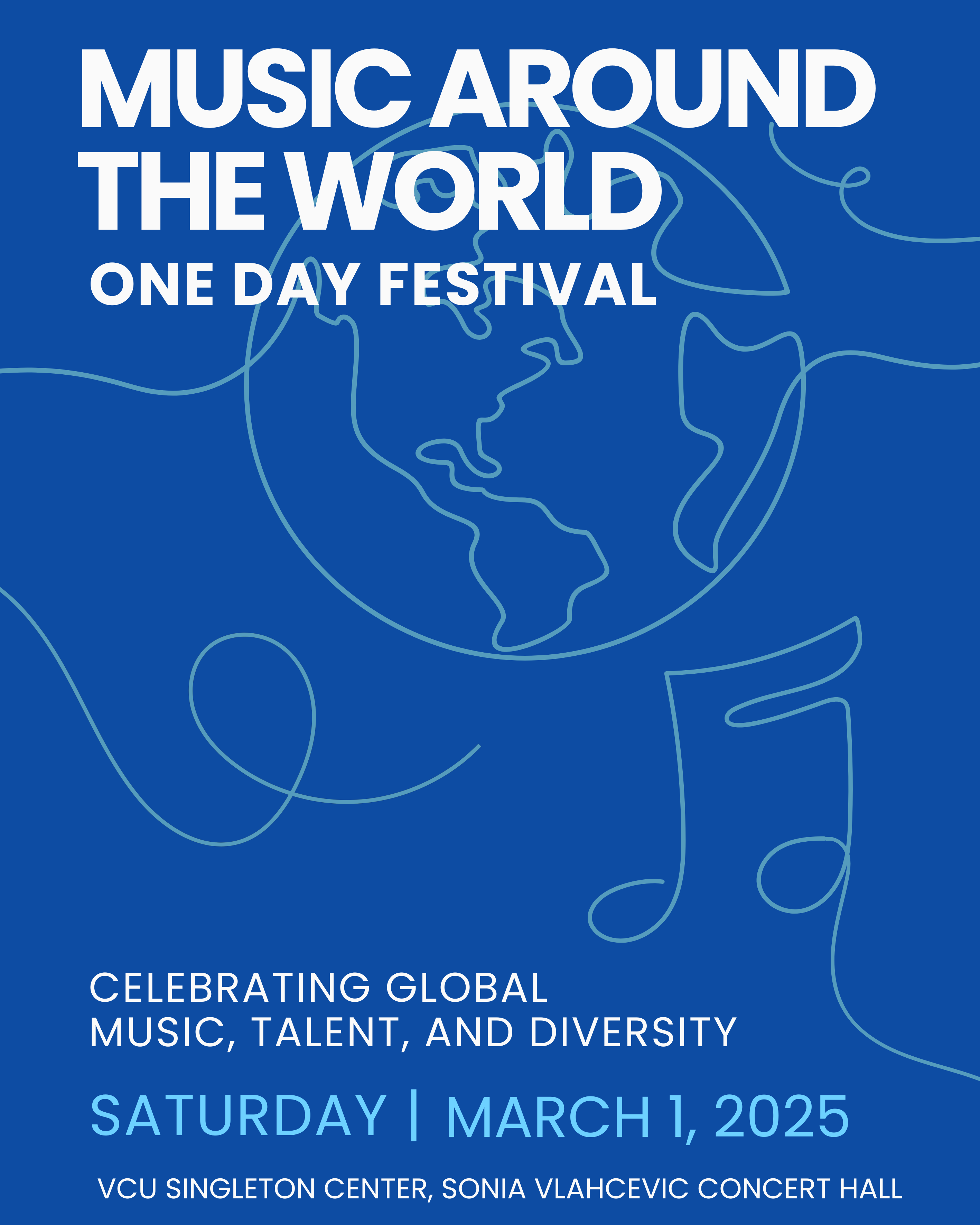 Virginia Commonwealth University (VCU) and the VCU Piano Area, in collaboration with the Richmond Music Teachers Association (RMTA), are excited to present Music Around the World: One-Day Festival on Saturday, March 1, 2025, at the Sonia Vlahcevic Concert Hall, located in the W.E. Singleton Center for the Performing Arts (922 Park Ave, Richmond, VA 23284). This vibrant festival celebrates global music, talent, and diversity through a dynamic lineup of workshops, presentations, and performances featuring VCU faculty, students, and community musicians.