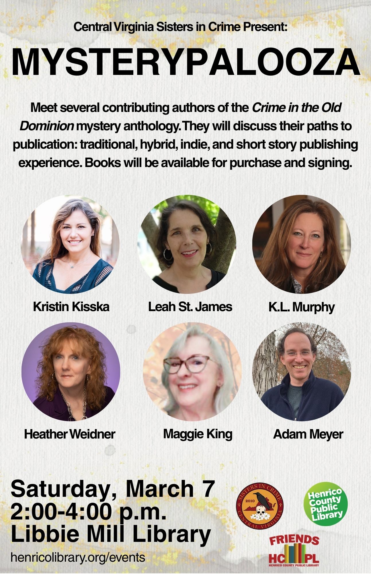 The Central Virginia chapter of Sisters in Crime is proud to present its Mysterypalooza author panel. Meet several contributing authors of the Crime in the Old Dominion mystery anthology. They will discuss their paths to publication: traditional, hybrid, indie, and short story publishing experience. Books will be available for purchase and signing. Sponsored by the Friends of the Library.