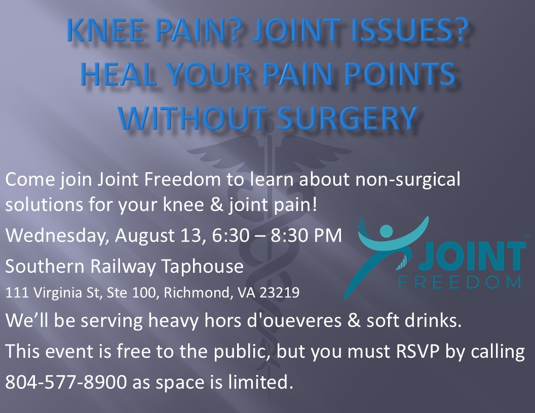 Come join Joint Freedom to learn about non-surgical solutions to knee and joint pain. We’ll be serving heavy hors d’oeuvres and soft drinks, along with a side of curiosity and knowledge. This event is free to the public, but you must RSVP by calling 804-577-8900 as space is limited.