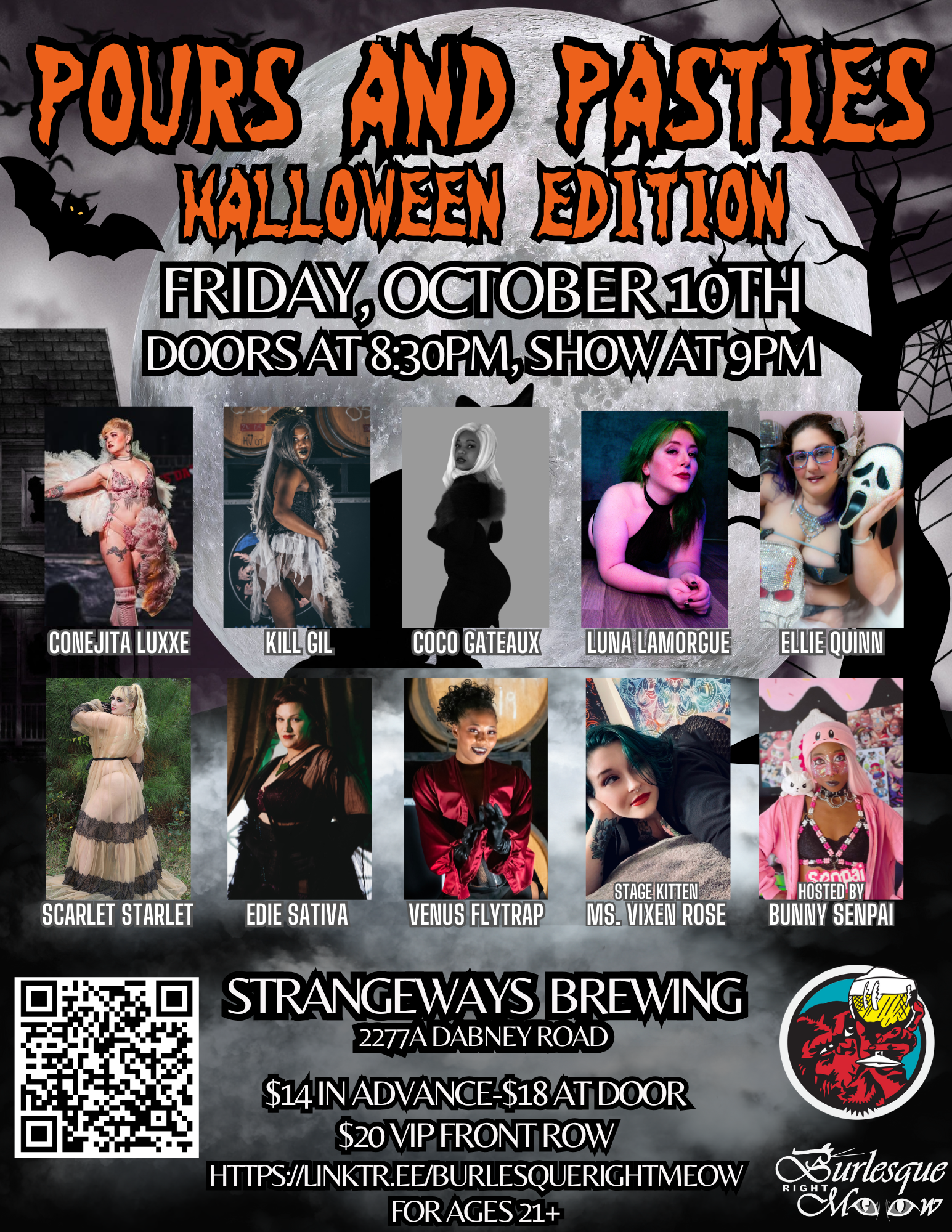 It’s the most wonderful time of the year: Halloween season! Burlesque Right Meow is back at Strangeways Brewing bringing you a little creepy, spoopy, and spectacular for October’s Pours and Pasties show! This cast of amazing performers from RVA and beyond are full of tricks and treats that are sure to delight you all night long! If you’re feeling the Halloween spirit, dress up and participate in our COSTUME CONTEST!