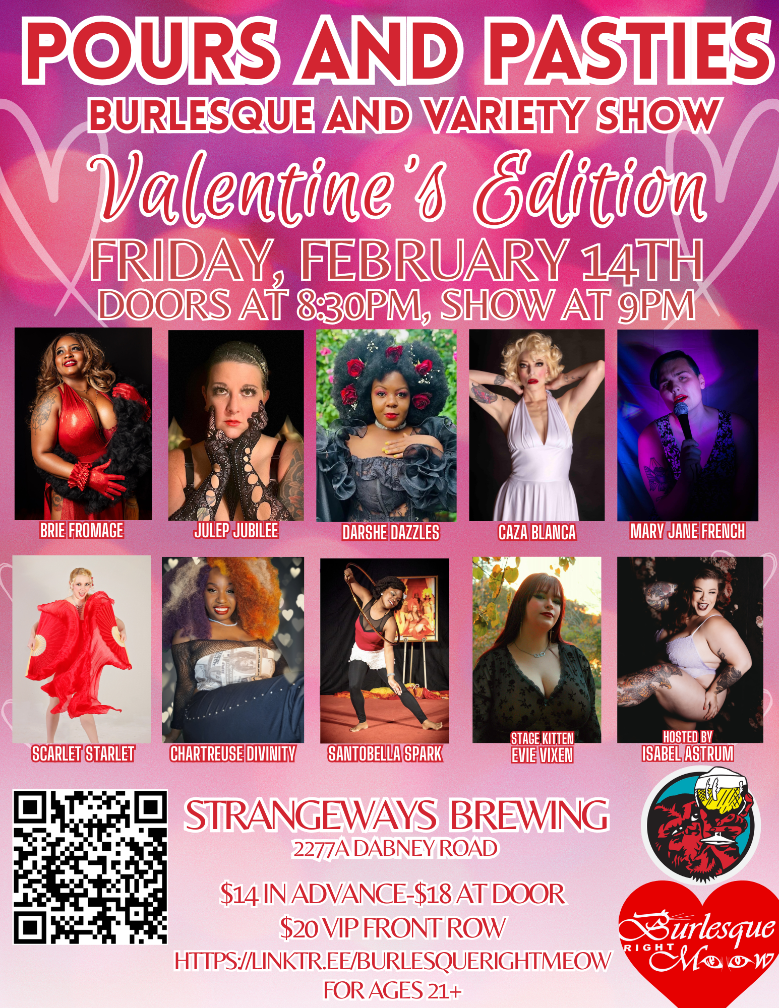 Celebrate Valentine’s Day with a unique twist at Strangeways Brewing! Whether you’re planning a romantic night out with your special someone or embracing self-love, there will be butts and there will be beer, so everyone is a winner here! Join us for a Valentine’s Day burlesque experience like no other, where love, laughter, and libations come together for an unforgettable celebration. Cheers to love and good times! ???