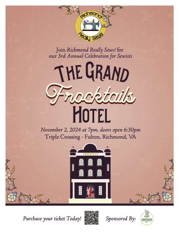 Richmond, VA – Join Richmond Really Sews! at Richmond Frocktails 2024 on Saturday, Nov 2, 2024 at 6:30 pm in Richmond, Virginia for an incredible, family-friendly evening of fashion and fun at this exciting fashion show, followed by a celebration for sewists, friends and guests!