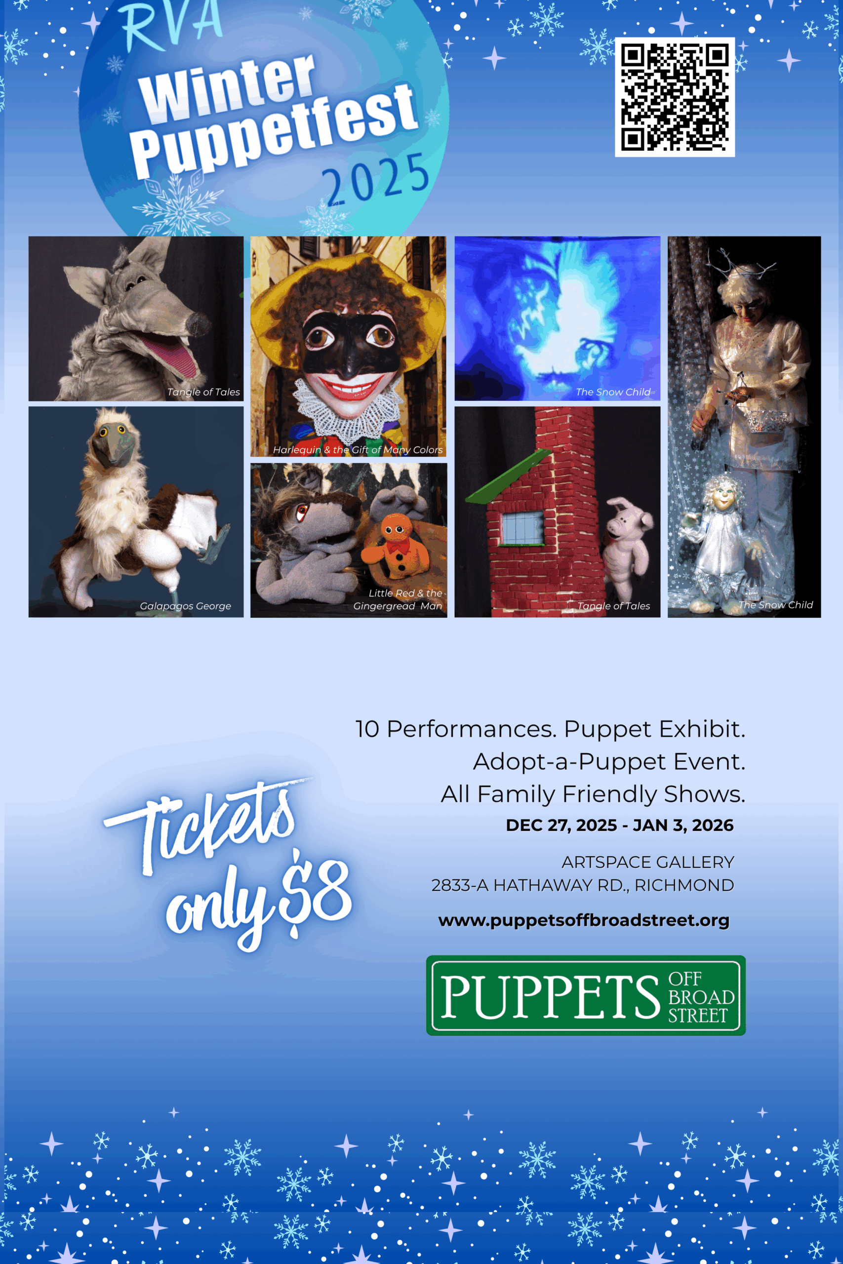 Bring out the family for the 8th annual RVA Winter Puppetfest! The festival is presented by Puppets Off Broad Street and features live family-friendly performances and an exhibit of puppets designed and built by nationally known puppeteers based right here in Central Virginia.
