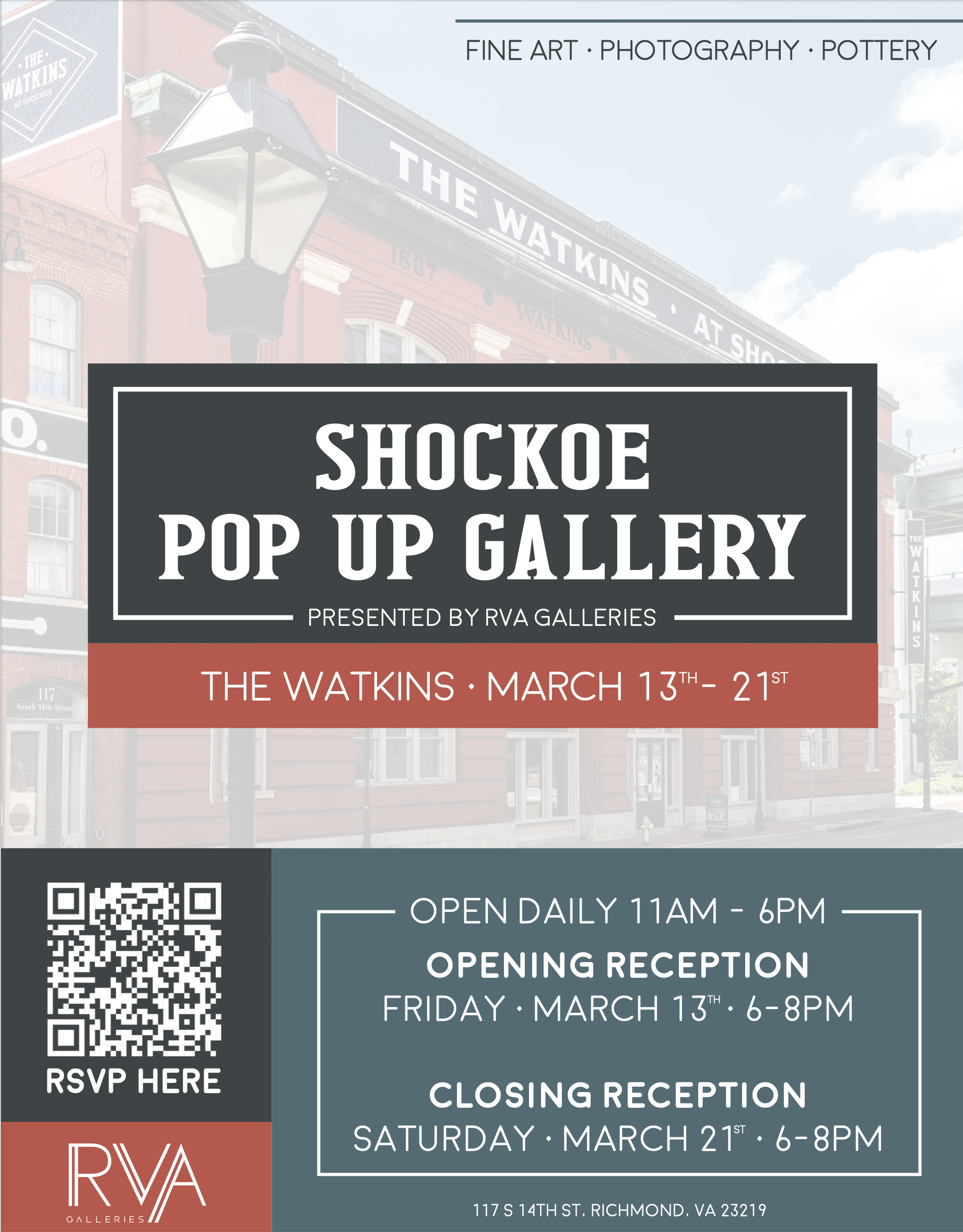 The Shockoe Pop-Up Gallery will host an opening reception on Friday, March 13, from 6–8 p.m. and will be open daily from 11 a.m.–6 p.m. throughout the week. The Watkins at Shockoe is located at the corner of Dock and 14th Streets in historic Shockoe Slip, with the gallery situated