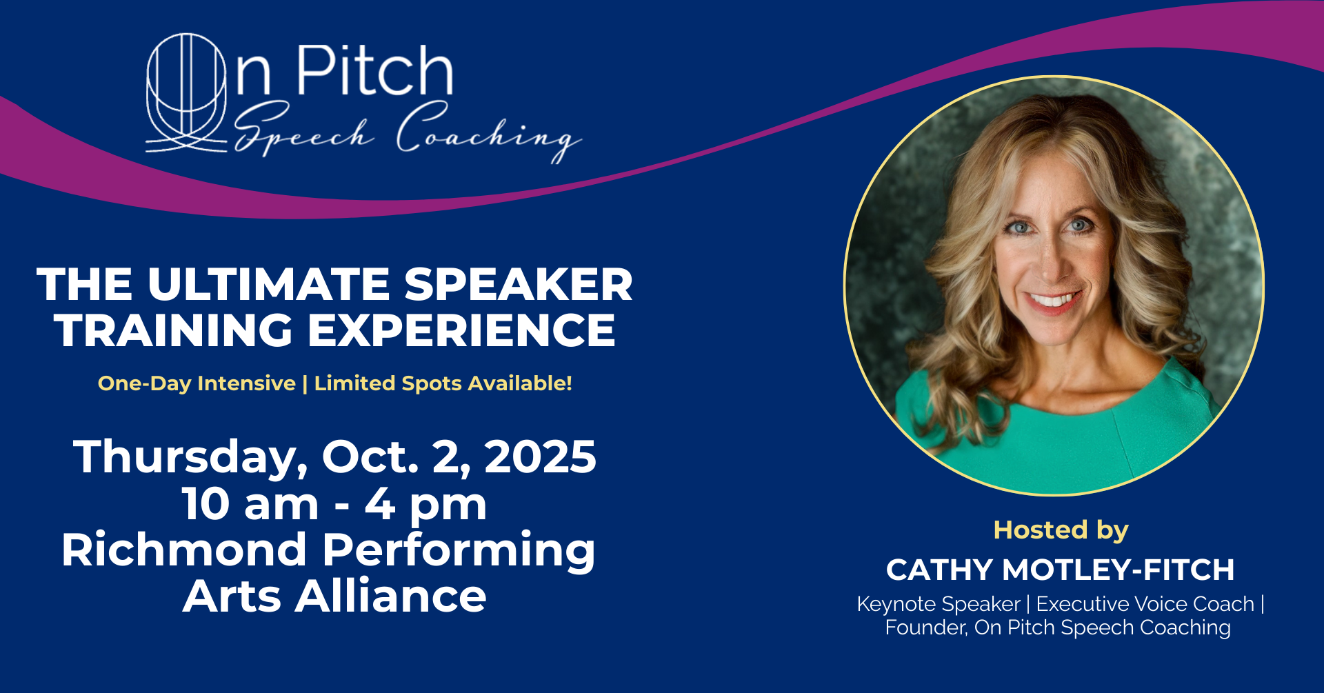 Give your voice the attention it deserves – and your dreams the launchpad they need. Led by industry expert and creator of On Pitch Speech Coach, Cathy Motley-Fitch, this special one-day-only workshop will featured hands-on coaching, live evaluations, impromptu speaking practice, improv for stage presence, voice & body language mastery, and real-time feedback from a top executive coach. If you’re seeking a jumpstart to help boost your conference in the board room, workplace, or even in front of friends, this is the workshop for YOU! Thursday, October 2, 2025, 10:00 am – 4:00 pm at Richmond Performing Arts Alliance, 400 E. Grace Street, Richmond, VA. Lunch provided. Limited spots, so make sure you sign up today! For more information, email cathy@onpitchspeechcoach.com.