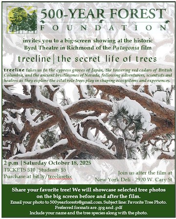 The 500-Year Forest Foundation invites you to a big screen showing at the Byrd Theatre of the Patagonia film treeline | the secret life of trees Saturday, Oct. 18th at 2 p.m. Student tickets: $5 Others $10.