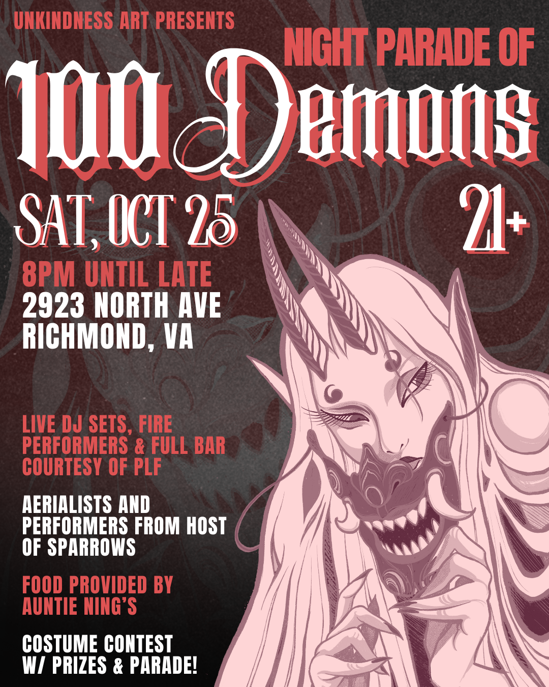 Join us starting at 8pm on Saturday, October 25th at Unkindness Art (2923 North Avenue, Richmond VA 23222) for a devilishly fun night of food & drink, music & dancing, performances & spooky costumes galore!