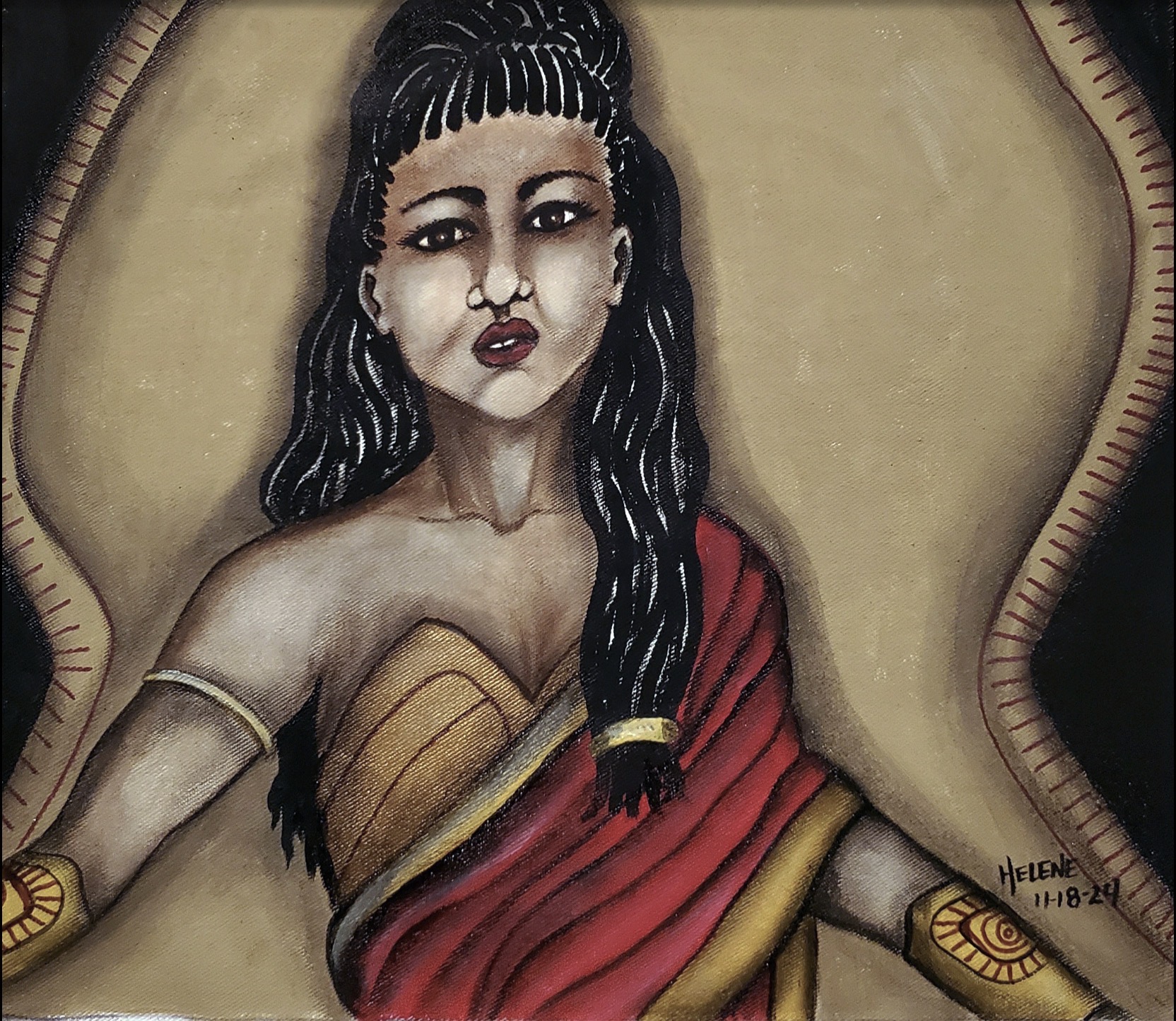 Philippus played an integral role in raising Princess Diana. Over the years, she worked alongside Hippolyta to teach Diana the ways of the Amazons. When Diana reached an age where she began to use her God-given powers recklessly, it was Philippus who approached Hippolyta, asking if she could help teach Diana the lesson of humility. I draw immense strength from my maternal grandmother, who was orphaned at only two weeks old and faced numerous hardships throughout her life. Despite all the obstacles, she survived, immigrated to this country alone, and carved a path for herself. Her essence was one of unwavering humility. To me, she embodied the spirit of an Amazonian warrior—resilient, strong, and graceful, which deepened my connection to the character. This inspired me to paint Philippus as her strength and resilience remind me of the ancient myth of the Amazons. According to legend, thousands of years ago, the Olympian goddesses—Artemis, Athena, Hestia, Demeter, and Aphrodite—gathered the souls of women slain by men throughout history and sent them to the depths of the Aegean Sea. From the sea, these souls formed bodies from clay, and thus, the Amazons were born. Philippus was one of these mighty women. The first to rise was Hippolyta, named Queen of the Amazons, followed by her sister Antiope, who became her second-in-command. Each goddess gifted the Amazons with unique strengths: Artemis gave them hunting prowess, Athena bestowed wisdom, Hestia provided warmth and home, Demeter ensured bountiful harvests, and Aphrodite granted beauty—both inner and outer. Over time, the Amazons founded Themyscira in Anatolia, becoming fierce warriors of peace, respected across Greece, Turkey, and Rome. – Helene Ruiz