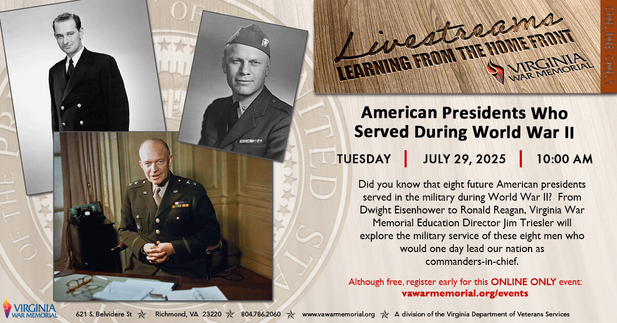 Did you know that eight future American presidents served in the military during World War II? From Dwight Eisenhower to Ronald Reagan, Virginia War Memorial Education Director Jim Triesler will explore the military service of these eight men who would one day lead our nation as commanders-in-chief.