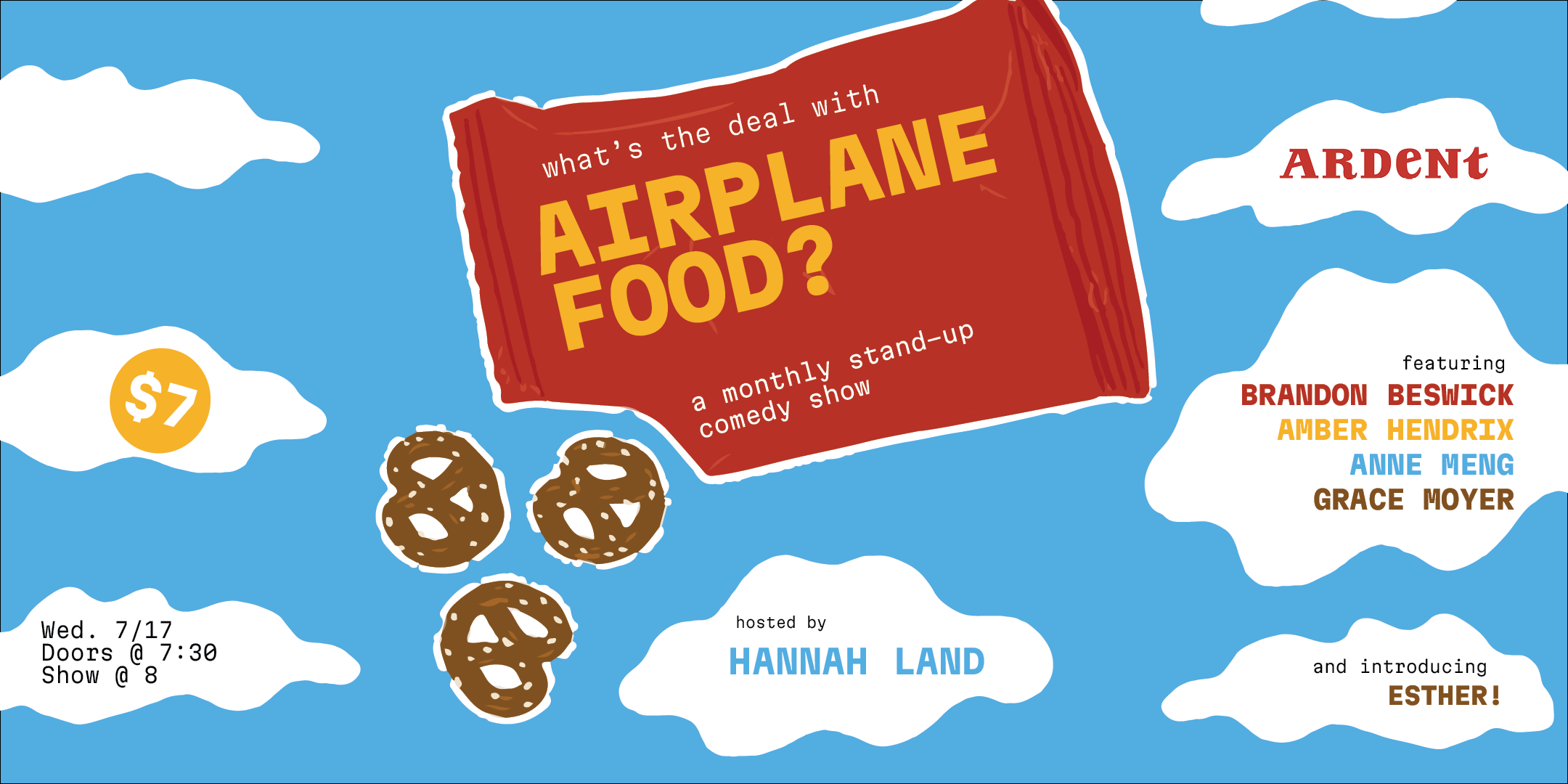 Each month’s show features great sets from four featured stand-up comedians and a special guest! Maybe someday, one of them will tell us what the deal really is with airplane food once and for all. Hosted by the not-yet-but-hopefully-soon-to be famous Hannah Land.