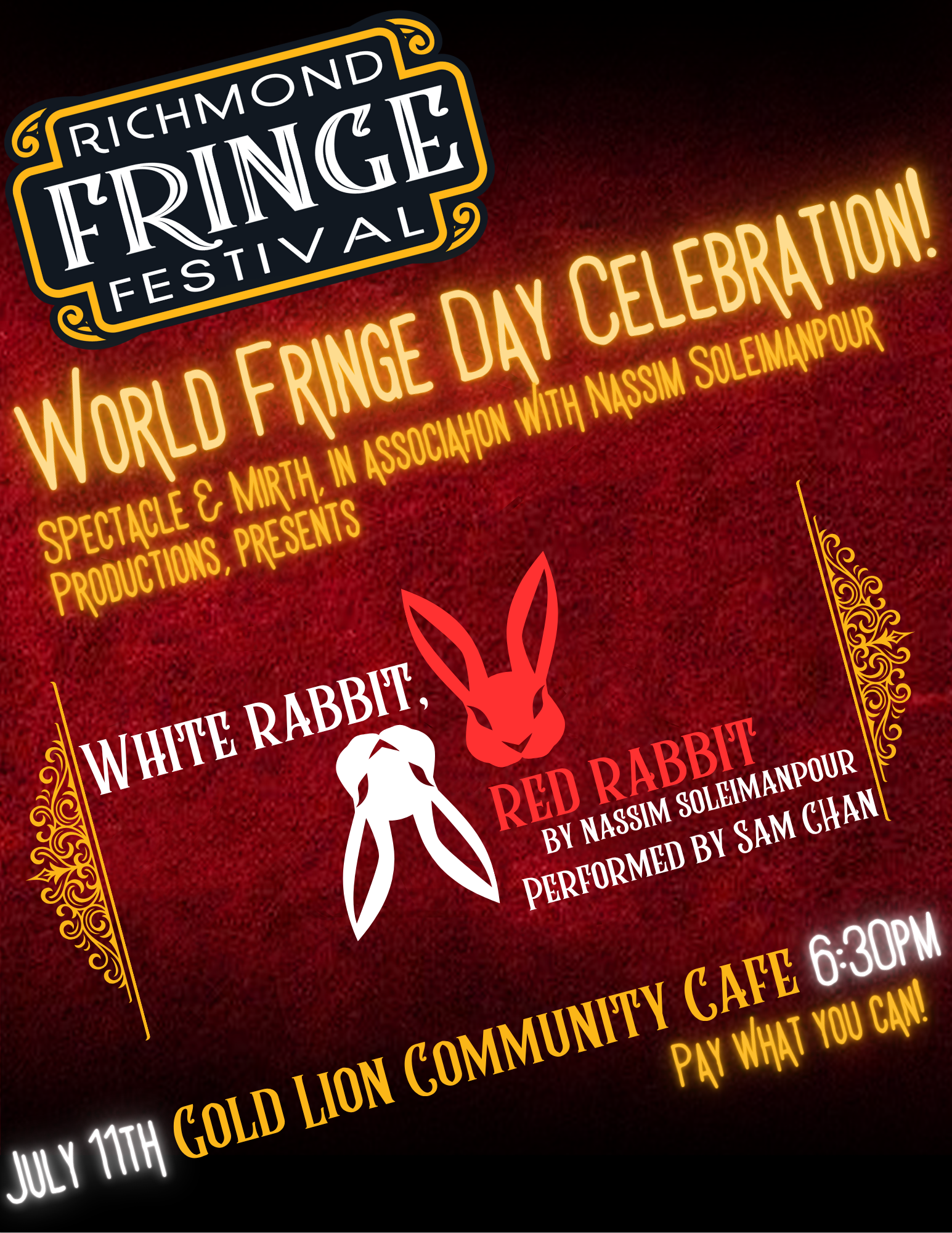 Join the Richmond Fringe Festival in celebrating World Fringe Day with a special one night only performance of the cult classic play White Rabbit Red Rabbit by Nassim Soleimanpour. Since its initial premier in 2011, White Rabbit Red Rabbit has been performed over 3000 times. Each performance invites a new actor who has never seen or read the script before to take the stage. What unfolds is perhaps one of the best kept secrets in theater history.